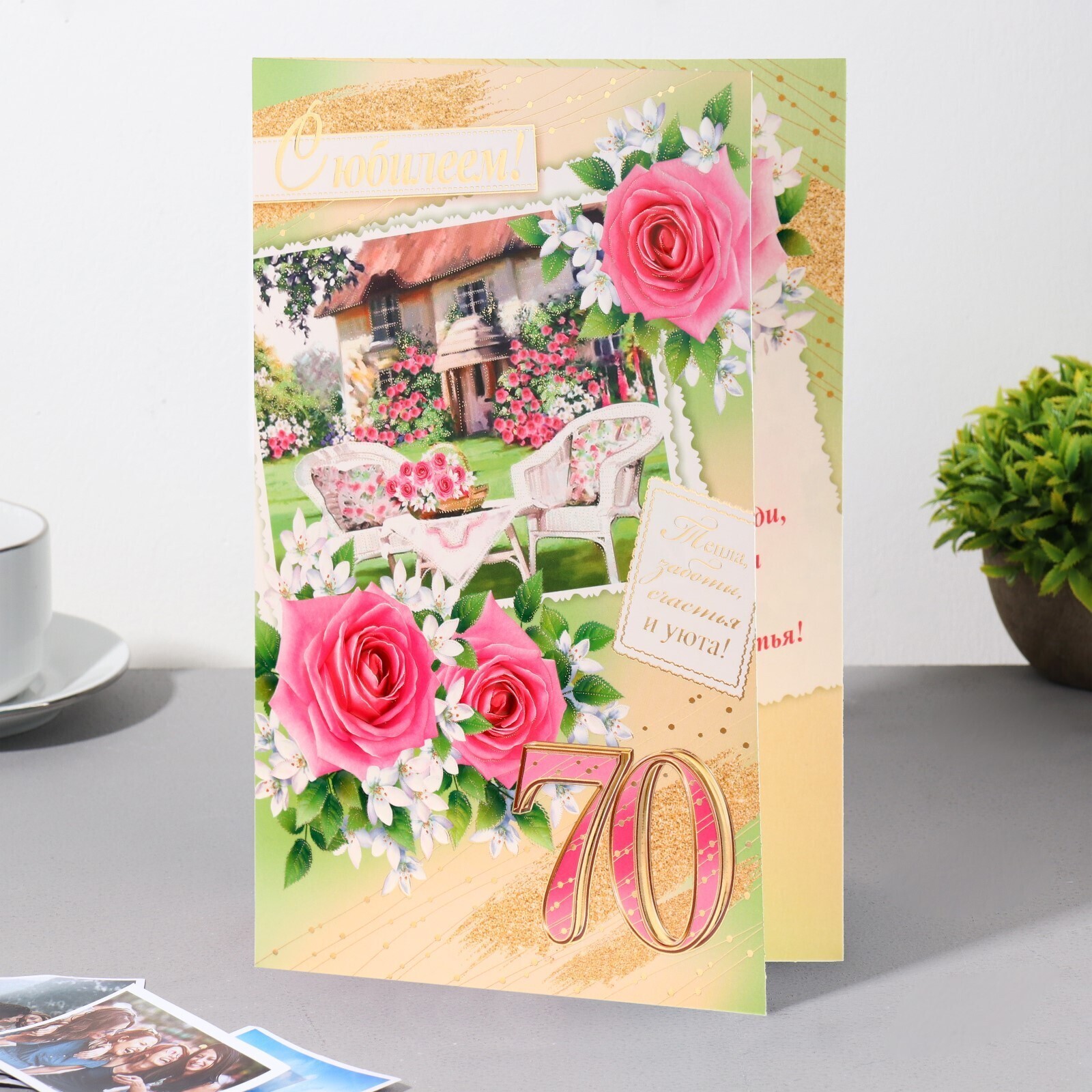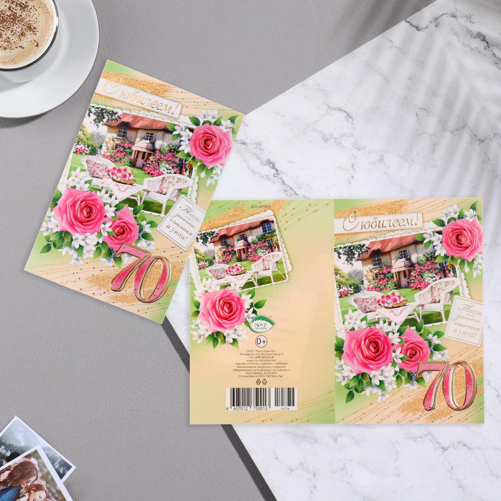 Открытка "С Юбилеем! 70" домик, розы, пожелание, 12,5х19 см