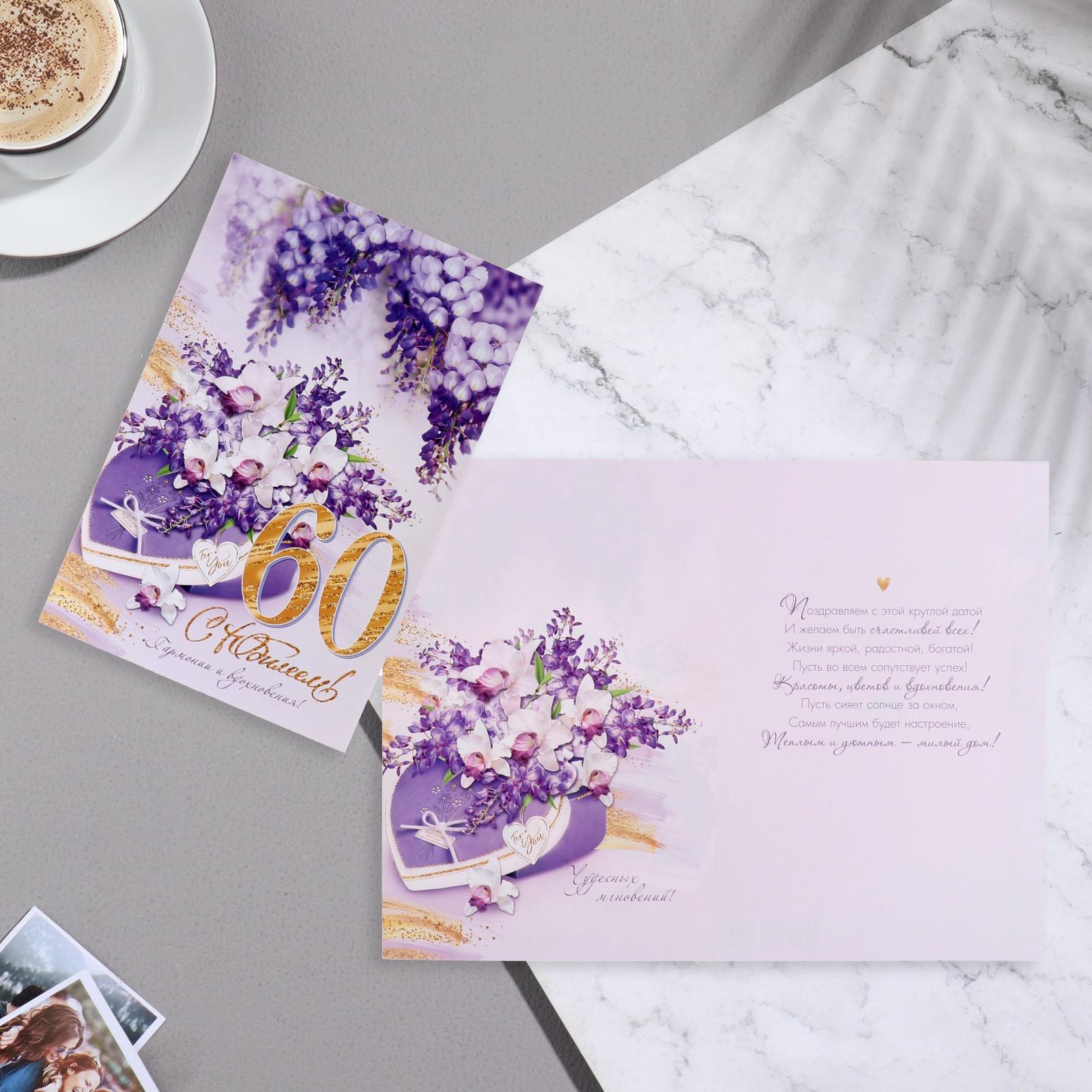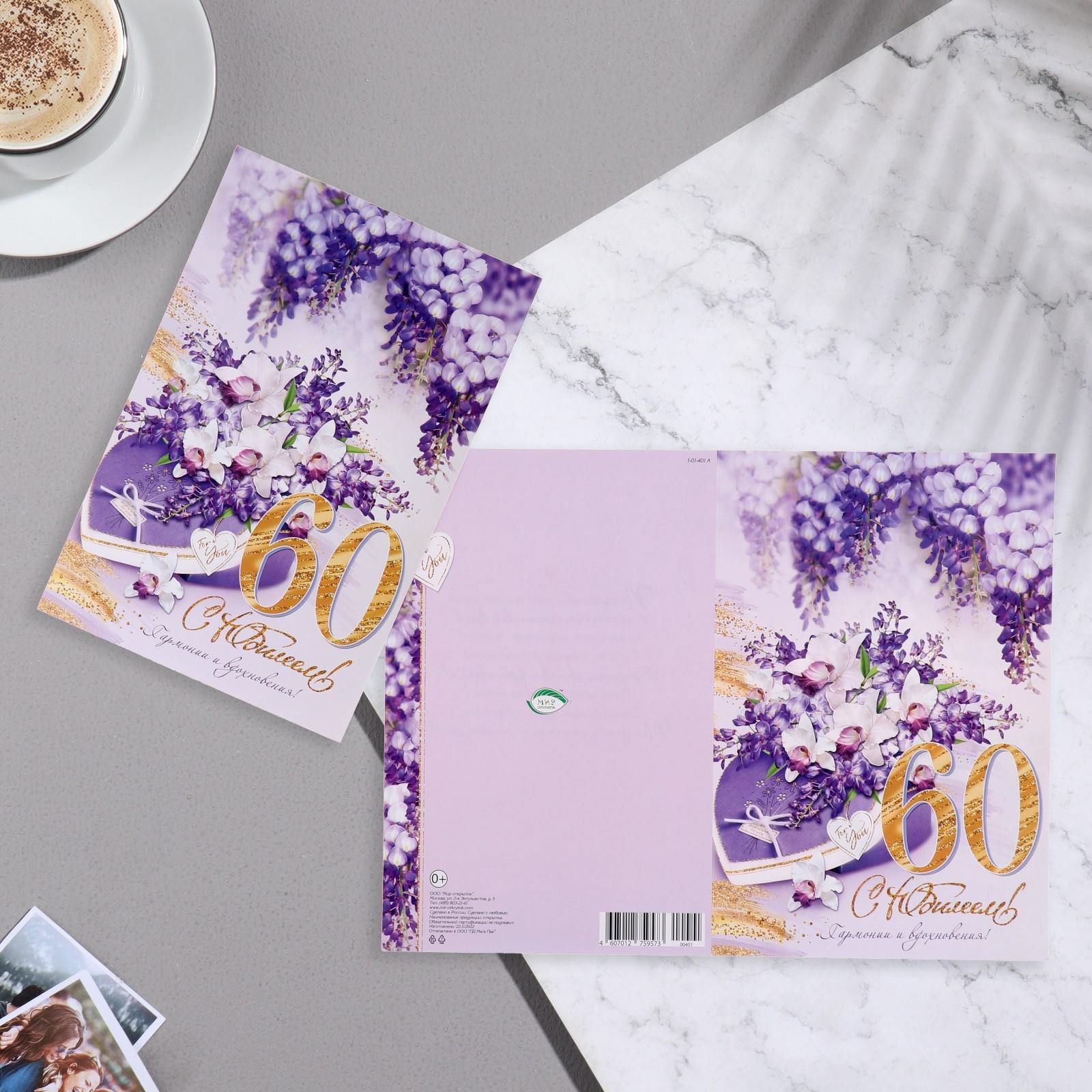 Открытка "С Юбилеем! 60" сирень, коробка, фиолетовые тона, 37,9х16 см