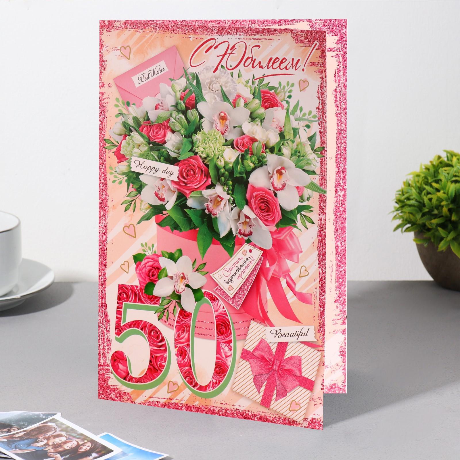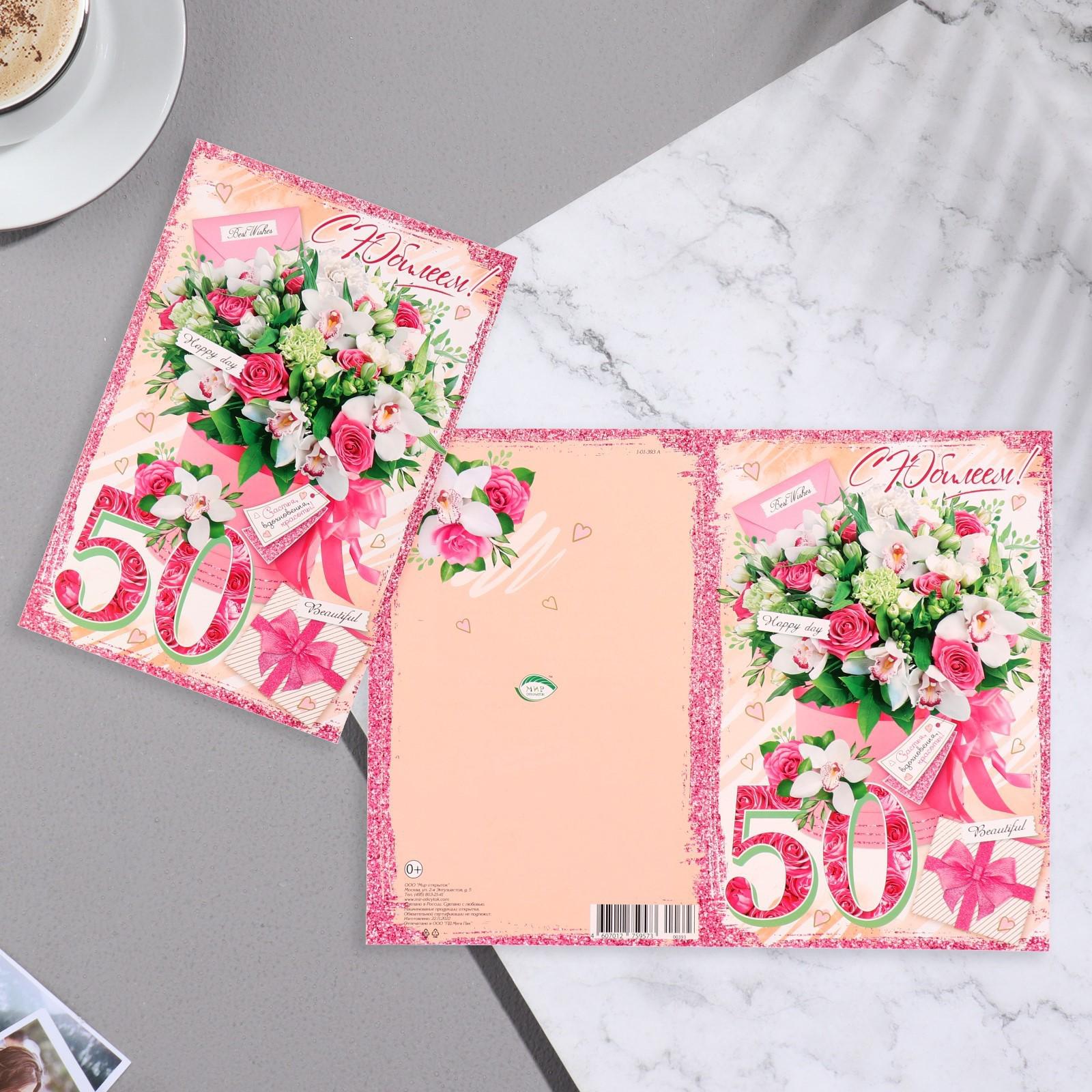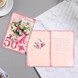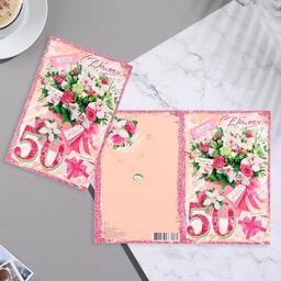 Открытка "С Юбилеем! 50" цветы, конверт, розовые тона, 37,9х16 см