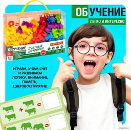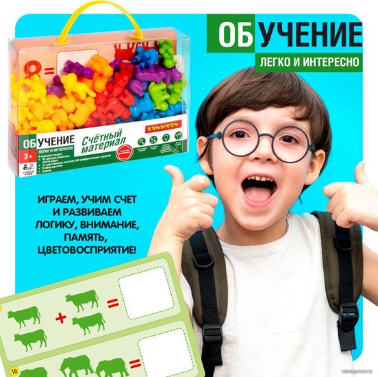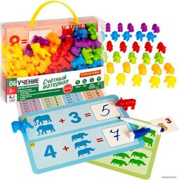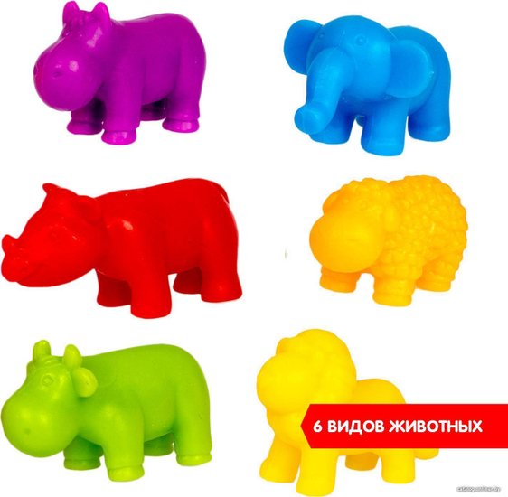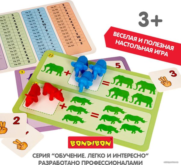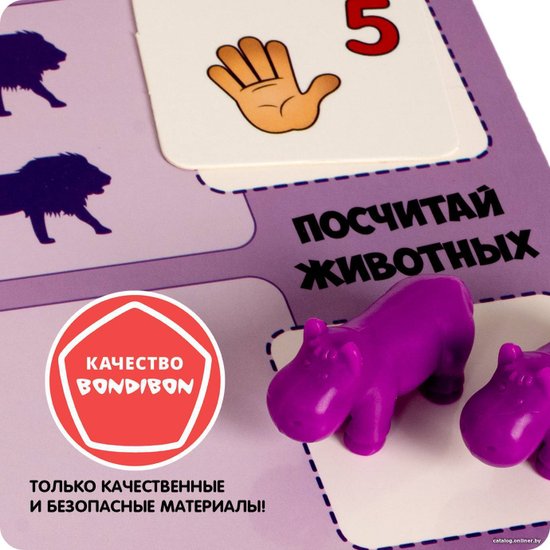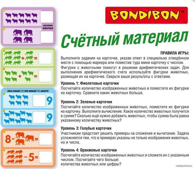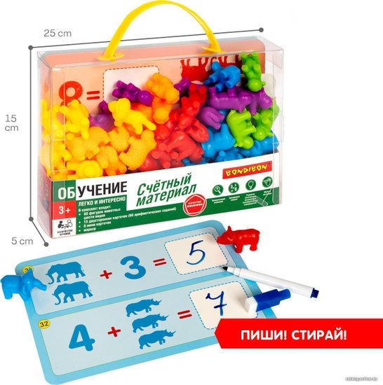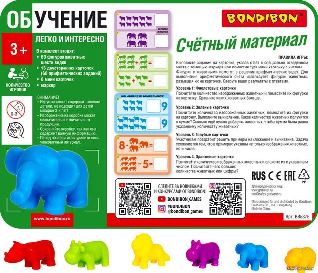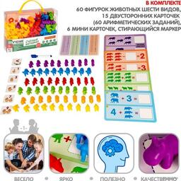 Комплектация•фигурки животных 6 видов 60 шт •15 двусторонних карточек - 60 арифметических заданий•стираемый маркер и 6 мини карточек.