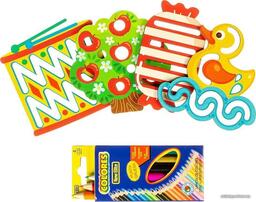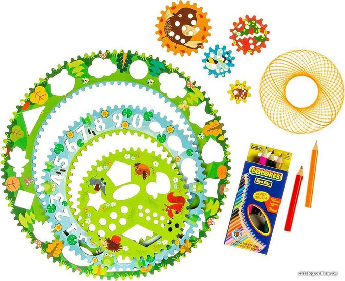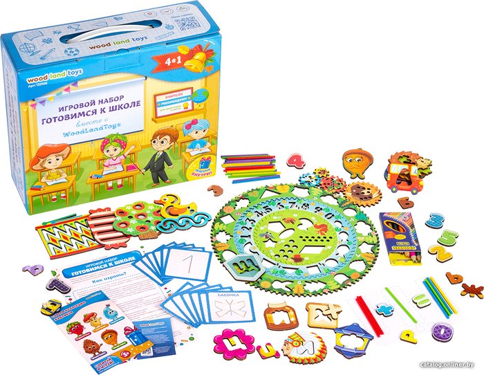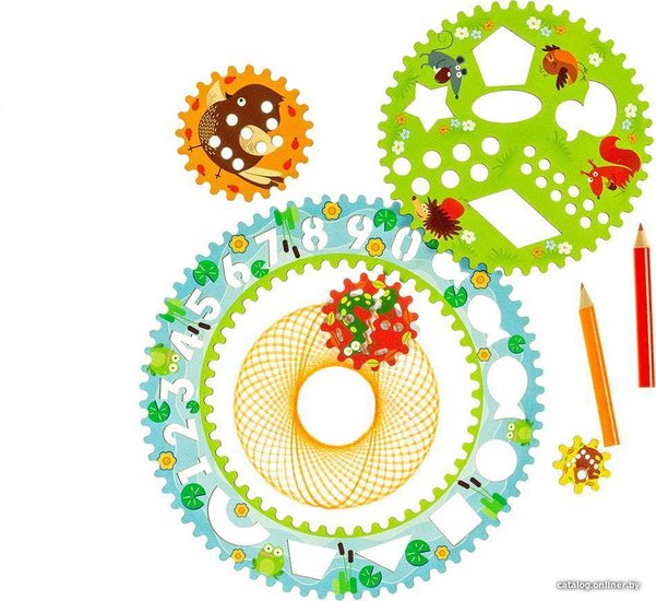 КомплектацияСпирограф, трафареты — 4 шт. Буквы — 66 деталей Счетные палочки — 35 шт. Цифры и знаки — 15 шт. Карточки со схемами сборки Карточки для примеров Инструкция Листовка про Вудлика Вудлик магнит