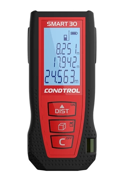 Condtrol Smart 30 - универсальный прибор для определения расстояний до 30 м, вычисления длины, высоты, площади и объема. Благодаря качественной протекторной защите он выдерживает падение с высоты и может использоваться как внутри помещений, так и на улице.