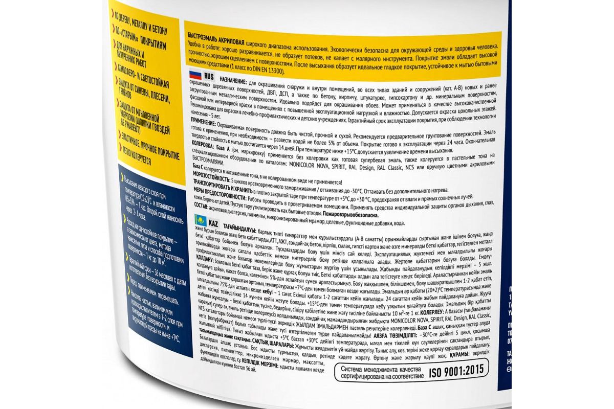Акриловая Быстроэмаль предназначена для высококачественной отделки и защиты деревянных, металлических, минеральных поверхностей, в качестве фасадной или интерьерной краски в том числе в помещениях с повышенной эксплуатационной нагрузкой (кухни, ванные комнаты). Подходит для обоев под покраску.