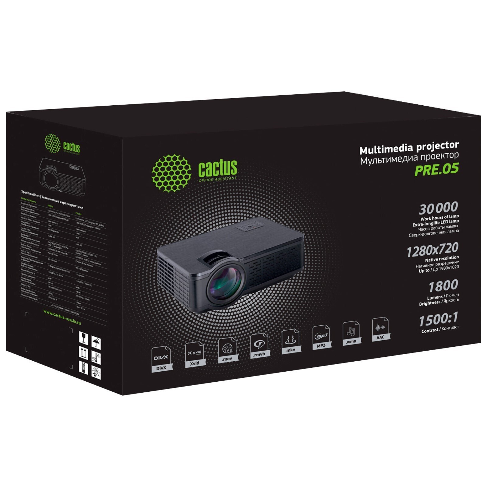 Проектор Cactus CS-PRE.05WT.WXGA-A, 1800лм, 1280x720, 1500:1, ресурс лампы:30000ч, USB, HDMI 93551