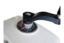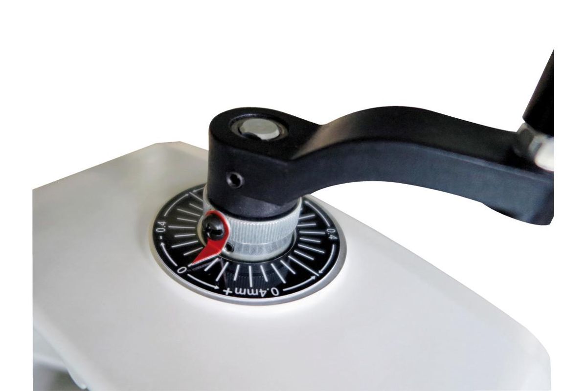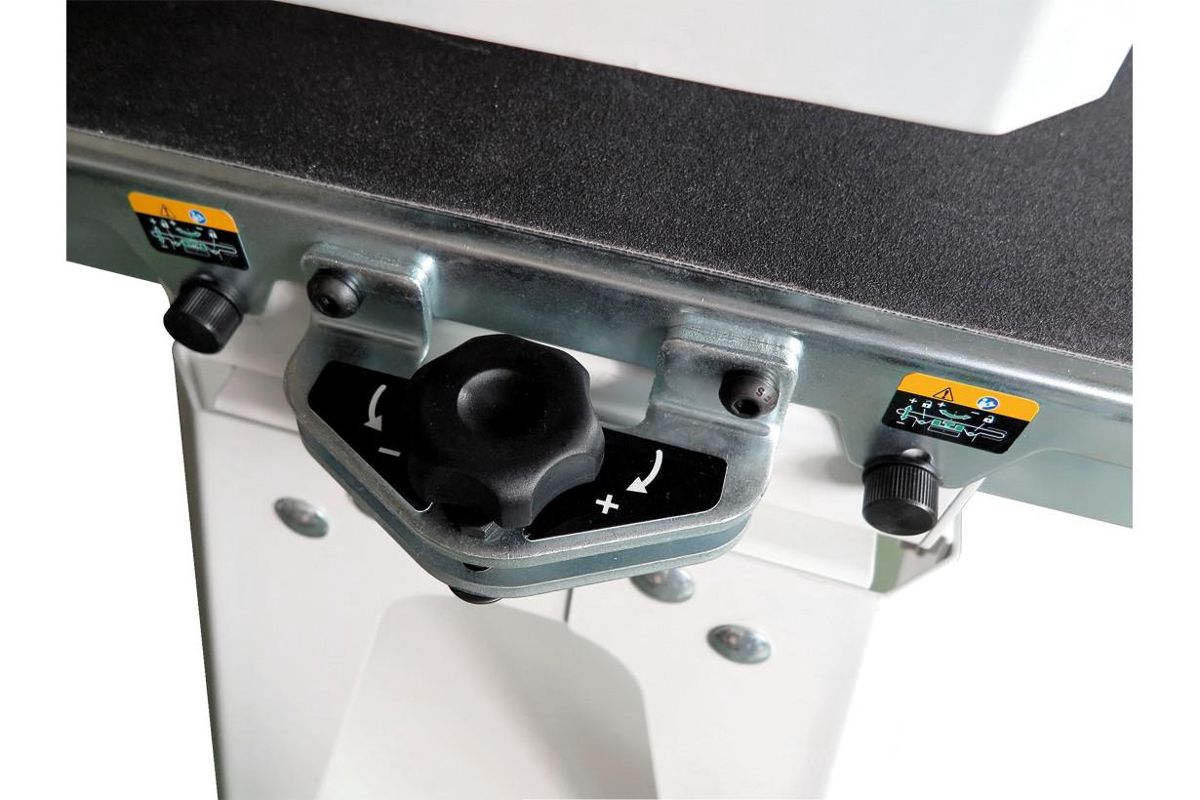 Высота над лентой транспортера регулируется вращением рукоятки, при этом можно контролировать как абсолютное значение по миллиметровой шкале на корпусе, так и относительное перемещение по лимбу на рукоятке. Регулировка параллельности вала и основания производится без вспомогательного инструмента: два фиксатора и винтовой упор оборудованы барашковыми рукоятками.
