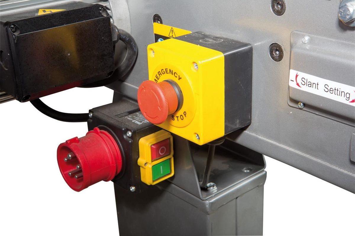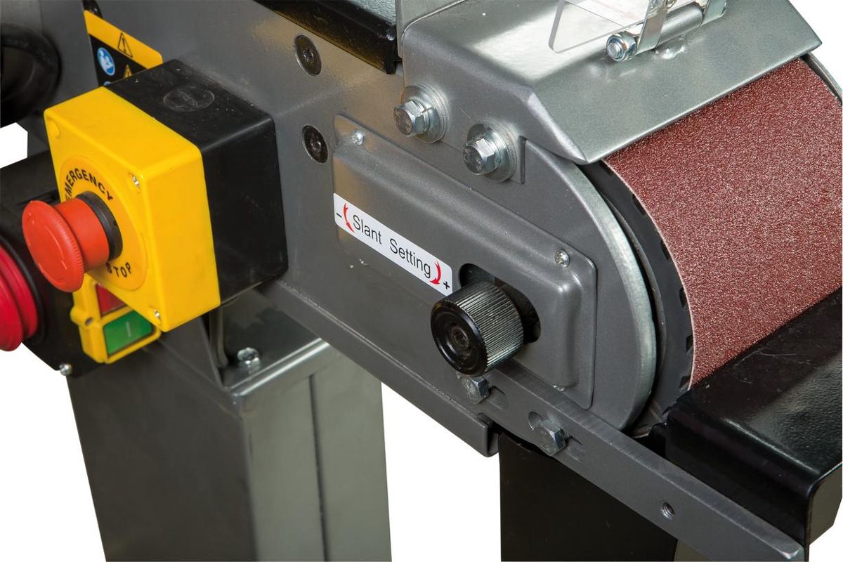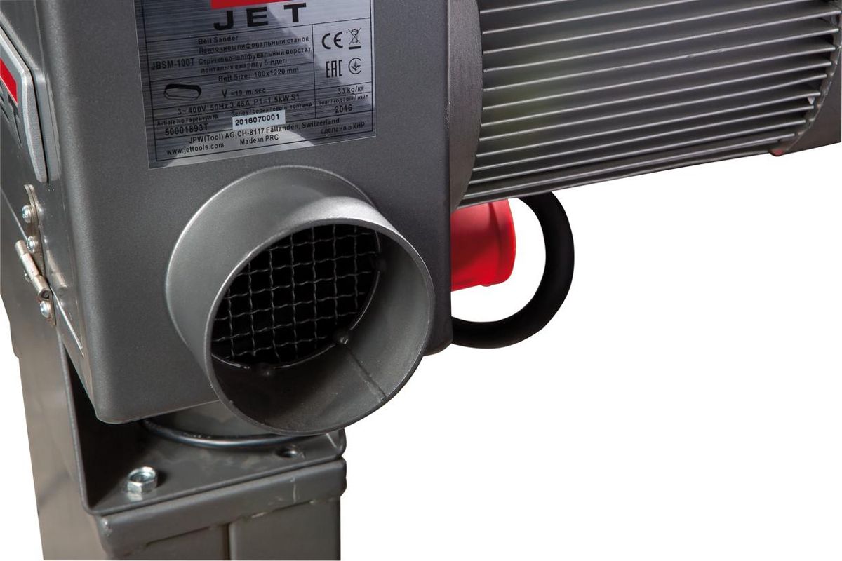 Для обеспечения безопасности оператора опасная зона рядом с ведомым роликом защищена прозрачным экраном, предусмотрена верхняя крышка ленты для тех работ, когда не требуется обработка габаритных деталей. В зоне работы оператора предусмотрена кнопка аварийного отключения питания. Поскольку в процессе шлифовки неизбежно отделение большого объема стружки и пыли, к JBSM-100 можно подключить внешний стружкопылесос (диаметр патрубка 100 мм) , также предусмотрено собственное устройство пыле-стружкоотведения с патрубком 97 мм. Для повышения устойчивости и снижения вибраций в зоне шлифования конструктив станка помещен на прочную станину, которая имеет широкое основание и крепится к полу при помощи винтов.