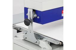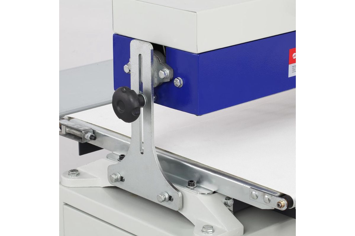 Максимальная ширина обрабатываемой заготовки составляет 555 мм. Положение шлифовального блока легко настраивается вращением маховика. Максимальная высота заготовки – 80 мм, минимальная – 5 мм. Кроме основного стола (основания транспортера), имеются две дополнительные секции для удобного позиционирования заготовки.