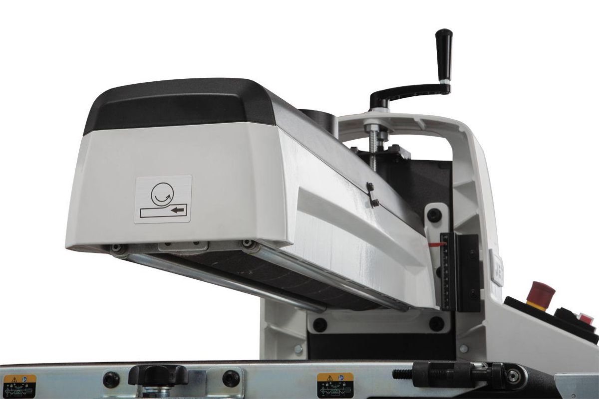 Модель оснащена консольным расположением рабочего модуля и автоматической подачи в виде конвейера с механическим приводом.