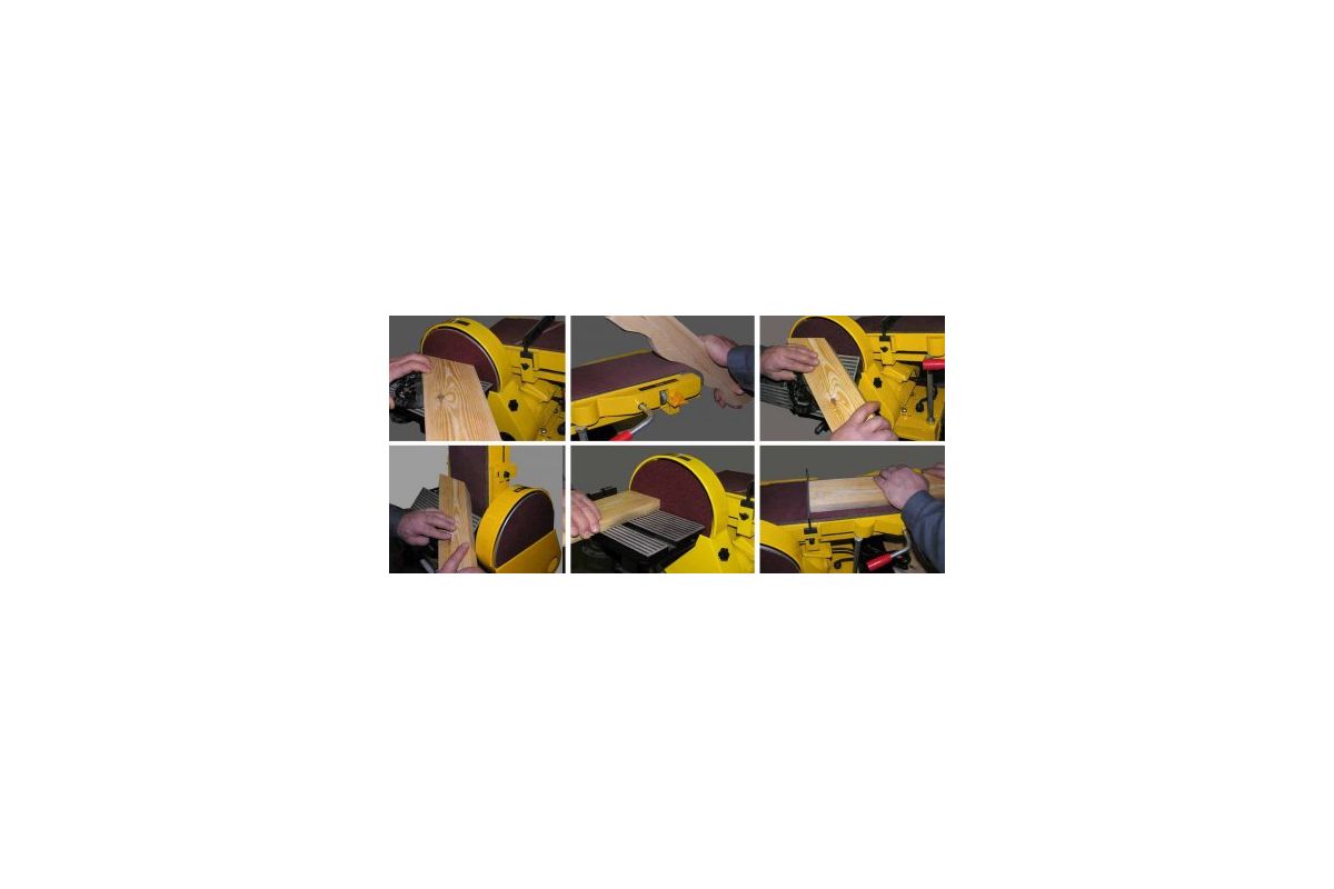 Угол наклона шлифовальных поверхностей изменяется. Угловой упор с транспортирной шкалой помогает установить точное положение. Переставной рабочий стол так же меняет положение. Это упрощает обработку торцов и кромок.