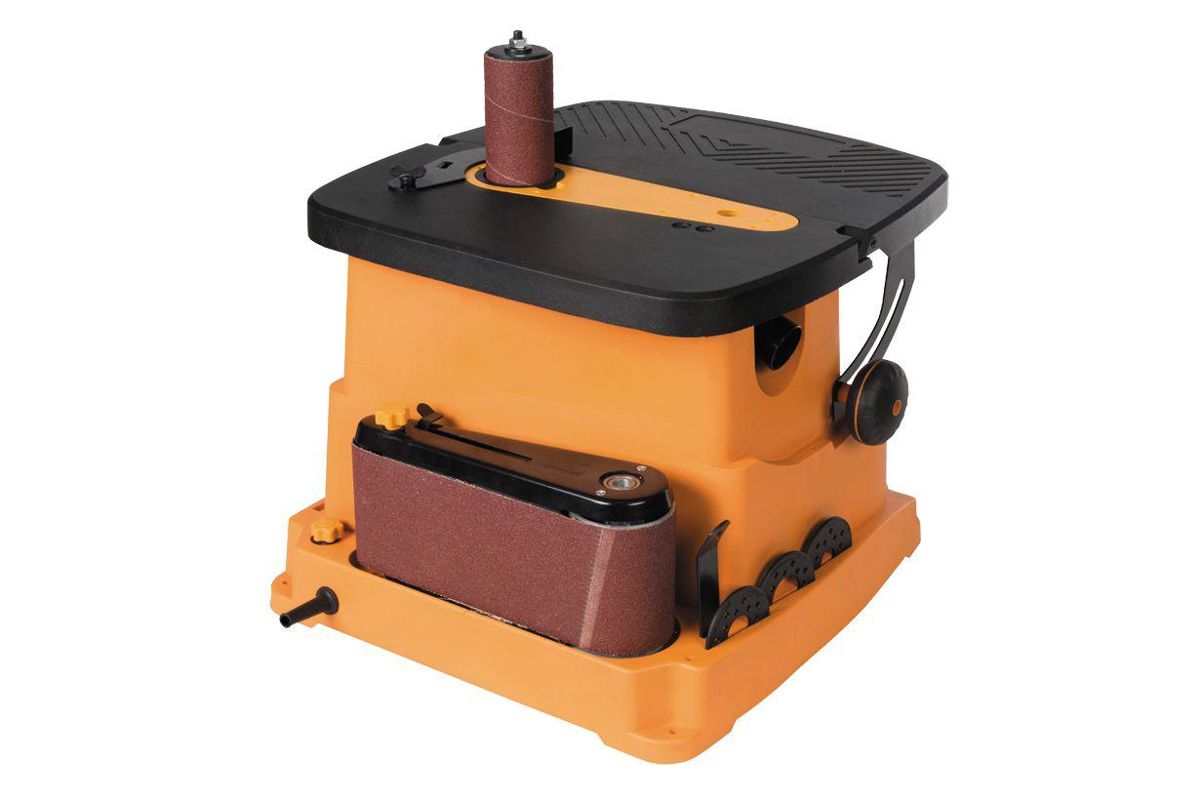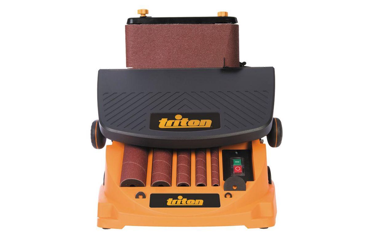 TRITON TSPST450 компактный шлифовальный станок с осцилляцией шпинделя для разнообразного применения в быту, в хобби и некоторых областях профессиональной обработки дерева. Комплектуется сразу двумя узлами, что позволяет выбирать наиболее подходящий в зависимости от решаемой задачи. Шпиндельный оптимален для работы с кромками и торцами, а так же позволяет «проходить» непрямые края заготовок с вогнутым профилем. В зависимости от кривизны обрабатываемой поверхности подбирают диаметр абразивной втулки, всего их пять, минимальный из них 13 мм. Высокая эффективность при использовании оснастки с такой небольшой рабочей поверхностью достигается за счет осцилляции – вертикальных перемещений вала - они увеличивают линейную скорость абразива, способствуют удалению пыли из области шлифования и предотвращают возникновение продольных царапин из-за дефектов абразива.