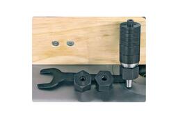 В комплект входят 30-миллиметровый шпиндель, цанговые зажимы (8 и 12 мм), боковой и верхний прижимы, фрезерный упор, устройство для фрезерования по дуге, поперечный упор.