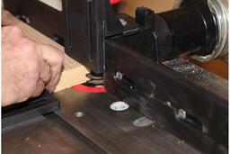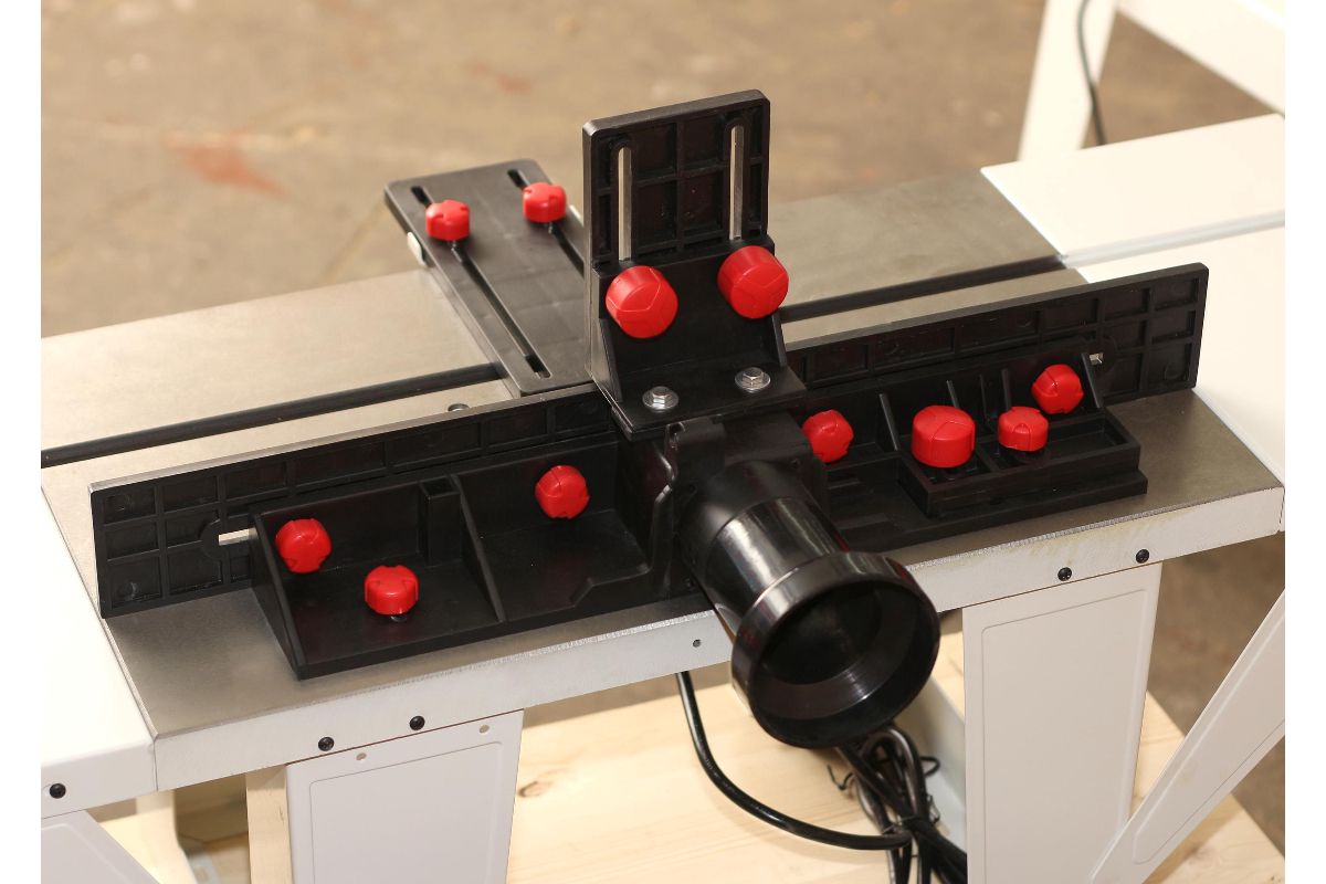 Фрезерный упор оснащён верхним прижимом и подстраиваемыми по вылету направляющими. Настраивается с помощью миллиметровой разметки на столе.