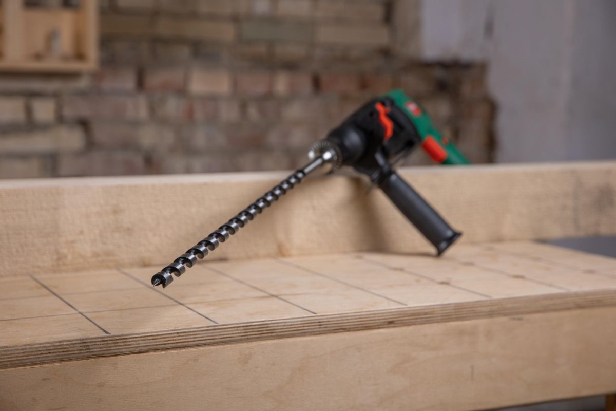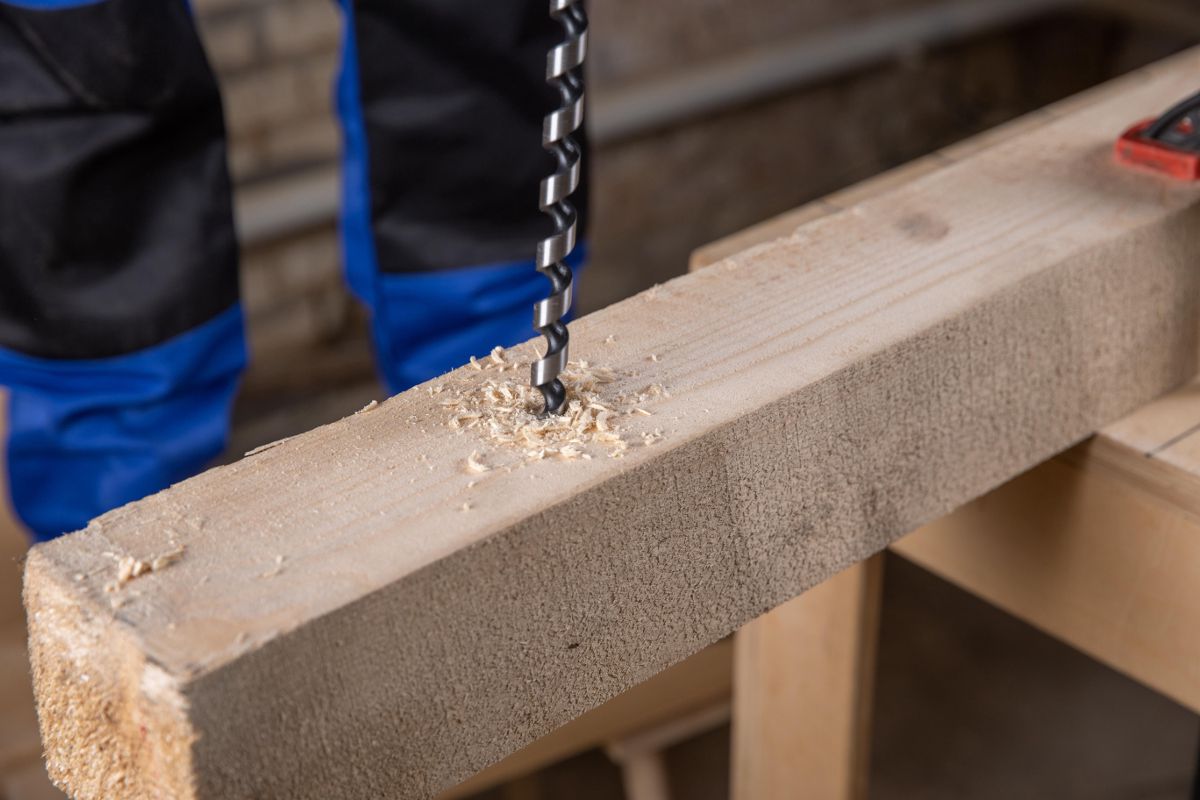 Винтовое сверло отлично подойдет для засверливания больших балок, перекрытий, брусьев и бревен.