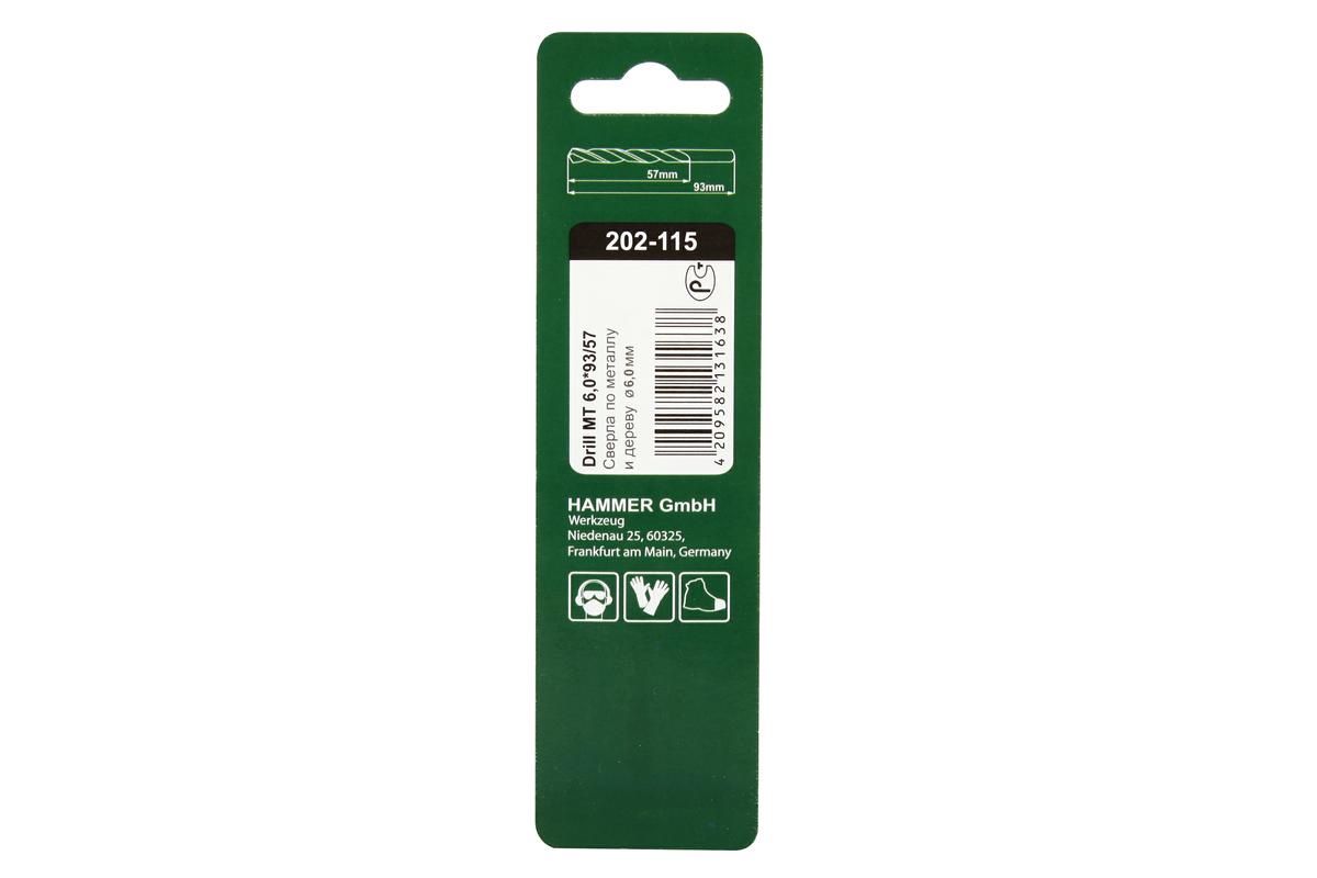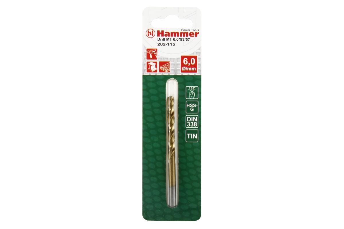 Сверло HAMMER Flex 202-115 DR MT 6,0мм*93/57мм металл, HSS, TIN