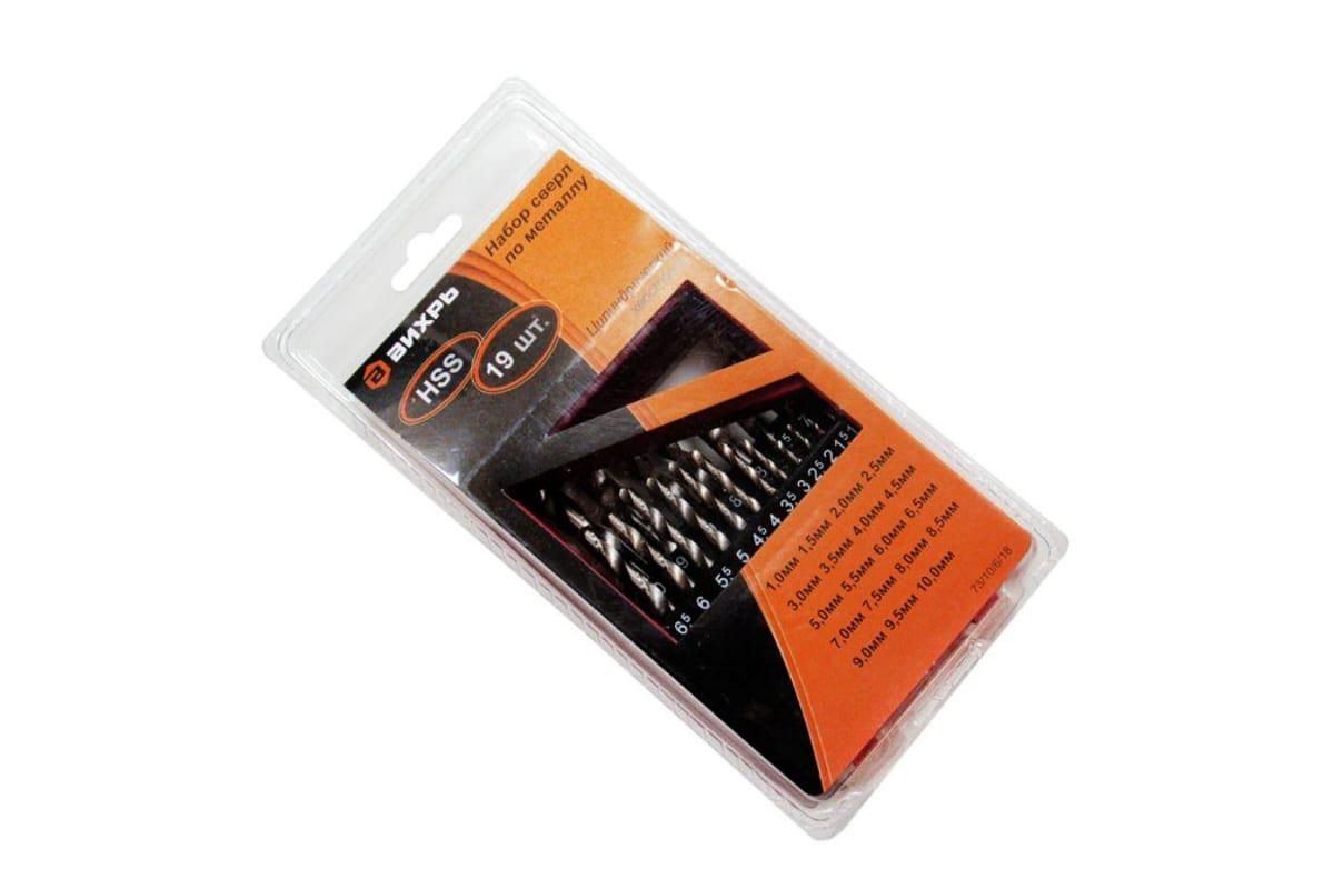 Набор сверл ВИХРЬ по металлу,1-10мм (через 0,5мм),HSS, 19шт.,металл.коробка