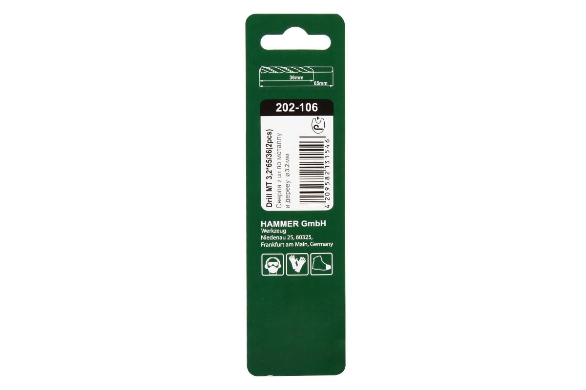 Сверло по металлу HAMMER Ф3.2х65мм (DR MT 3,2мм*65/36мм 2шт.)