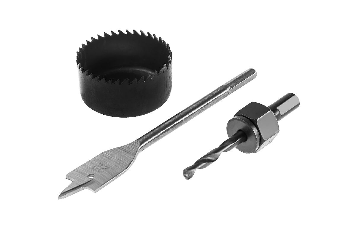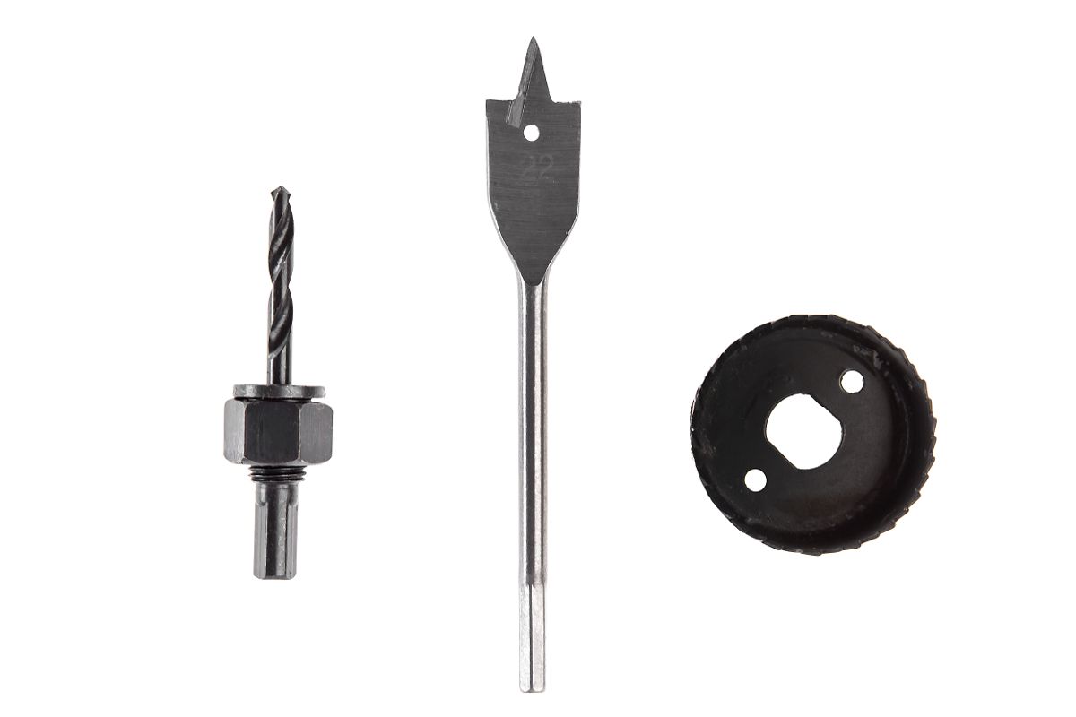 — Перовое сверло диаметром 22 мм пригодится для высверливания отверстия под защелку замка;