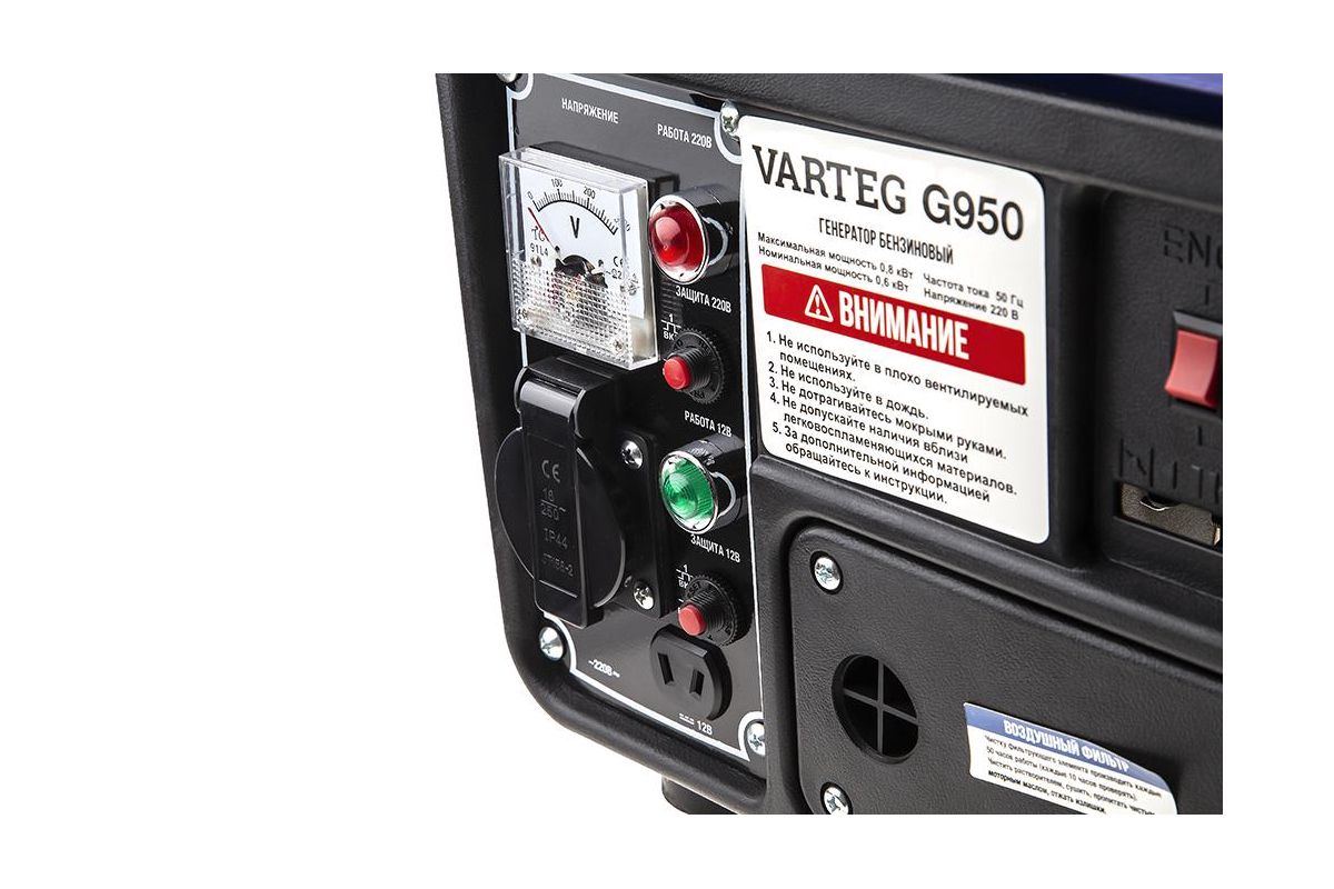 На корпусе генератора varteg g950 есть розетка 220В. Пыль и грязь не попадёт на неё благодаря крышке.