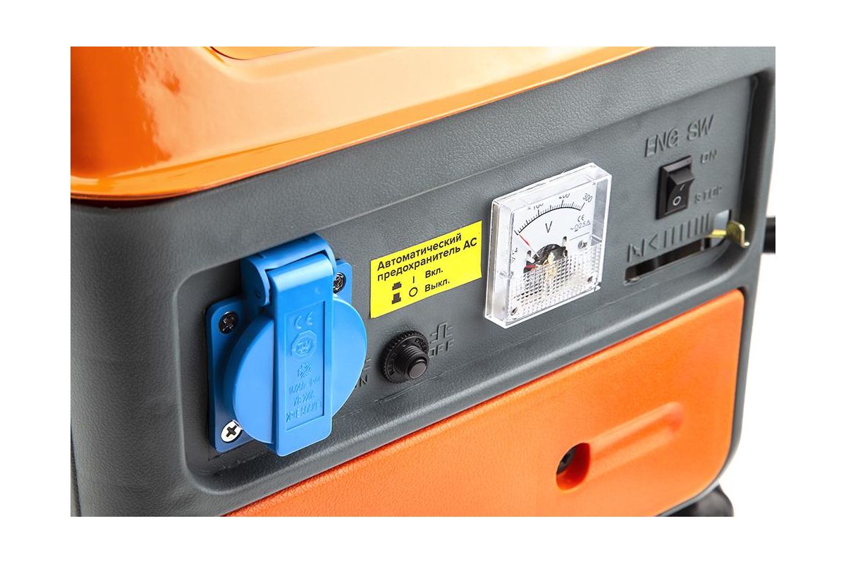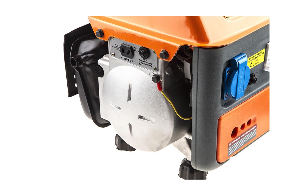 На корпусе есть розетка 220В и выход на клеммы 12В. От бензинового генератора КРАТОН GG-950M можно заряжать не только технику, но и автомобильные аккумуляторы.