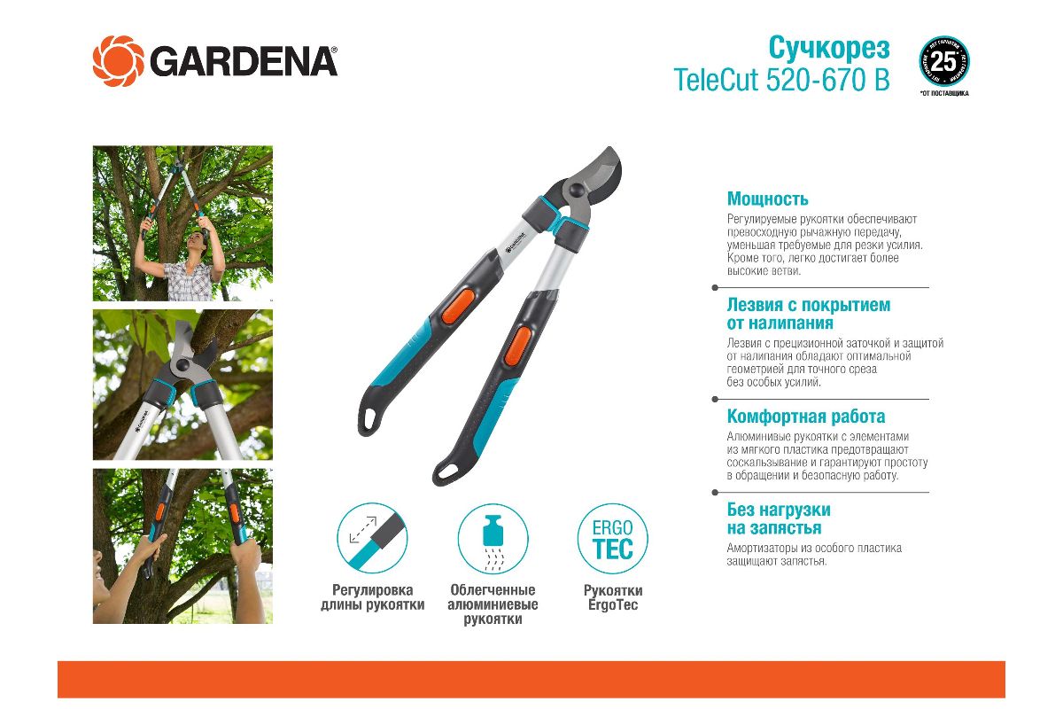 Сучкорез предназначается для резки веток. Имеет регулируемые по длине алюминиевые рукоятки, увеличивающие радиус действия и рычажный момент.