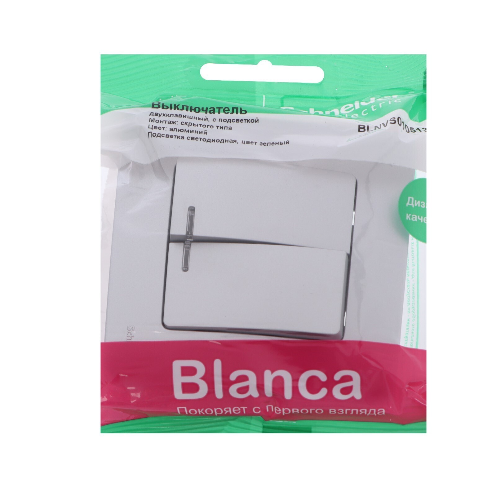 Выключатель SE Blanca, 10 А, 2 клавиши, IP20, скрытый, с подсветкой, алюминий, BLNVS010513