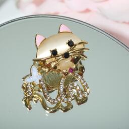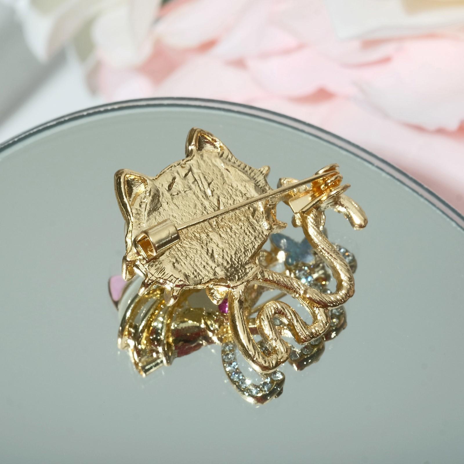 Брошь "Котёнок" с бабочкой, цвет бело-розовый в золоте
