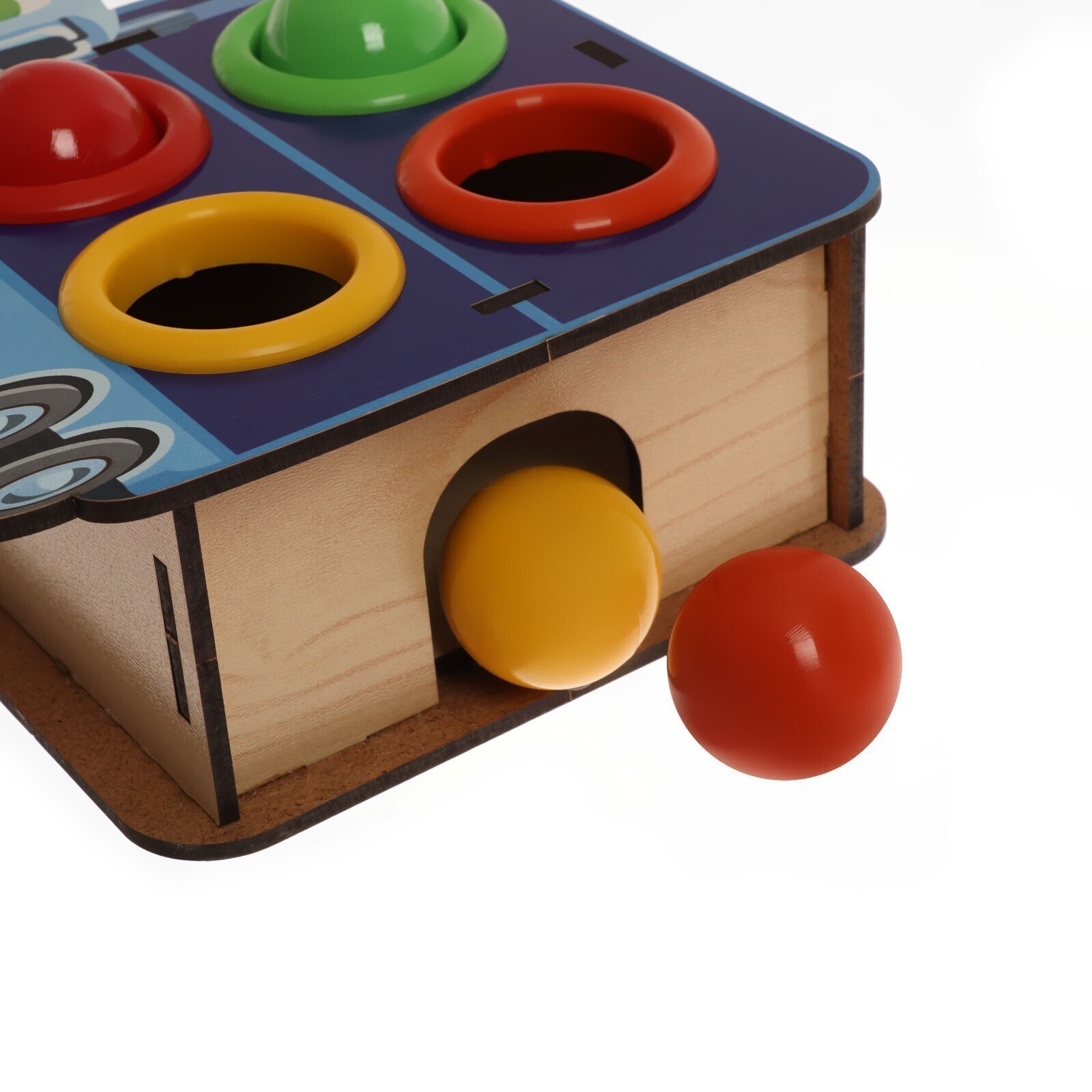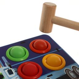 Юный испытатель берет в руки деревянный молоток, который входит в комплект, и забивает им шарик в отверстие. Когда достигнута цель, и круглый элемент попал в лунку, он выкатывается из коробочки! То же самое проделывается с остальными шарами.
