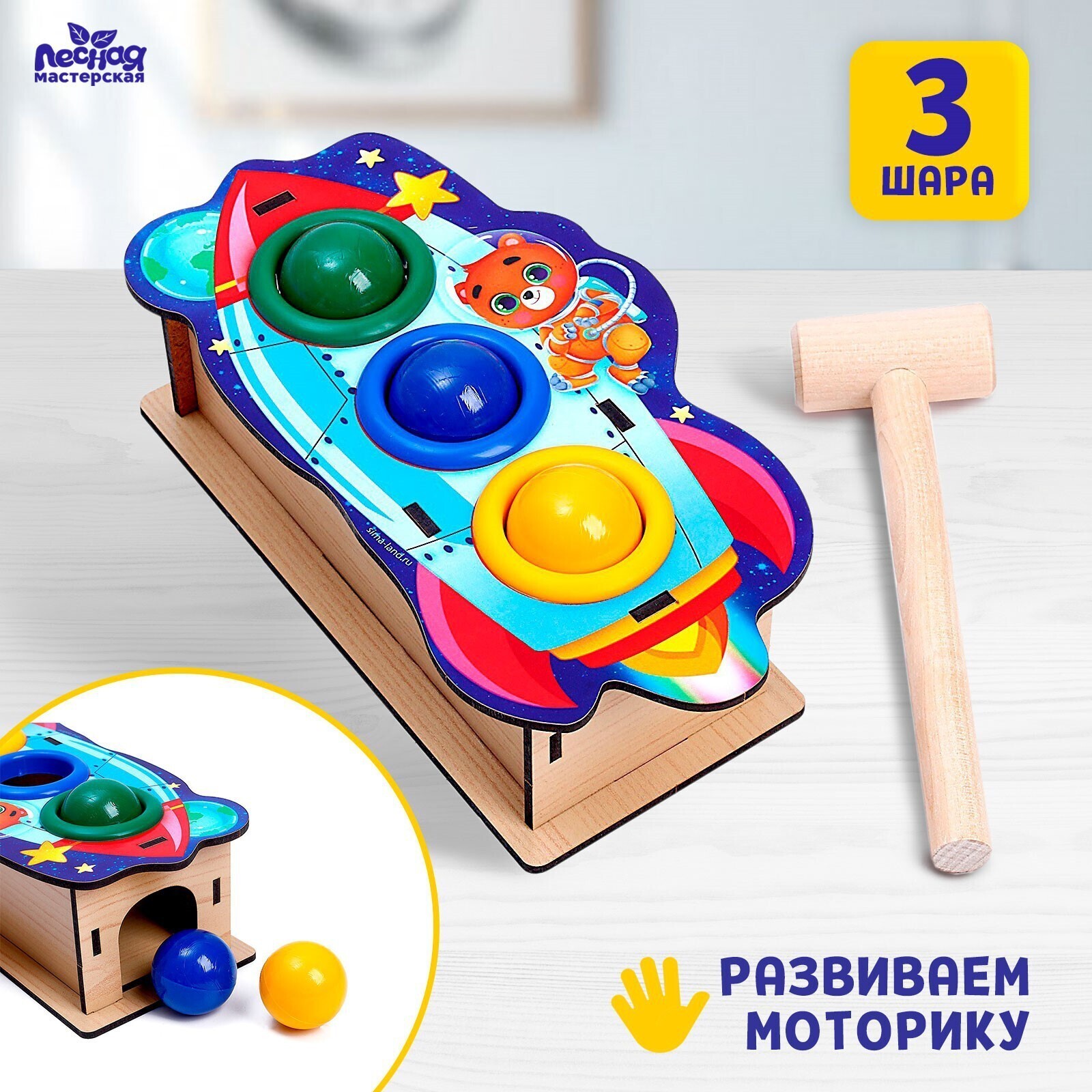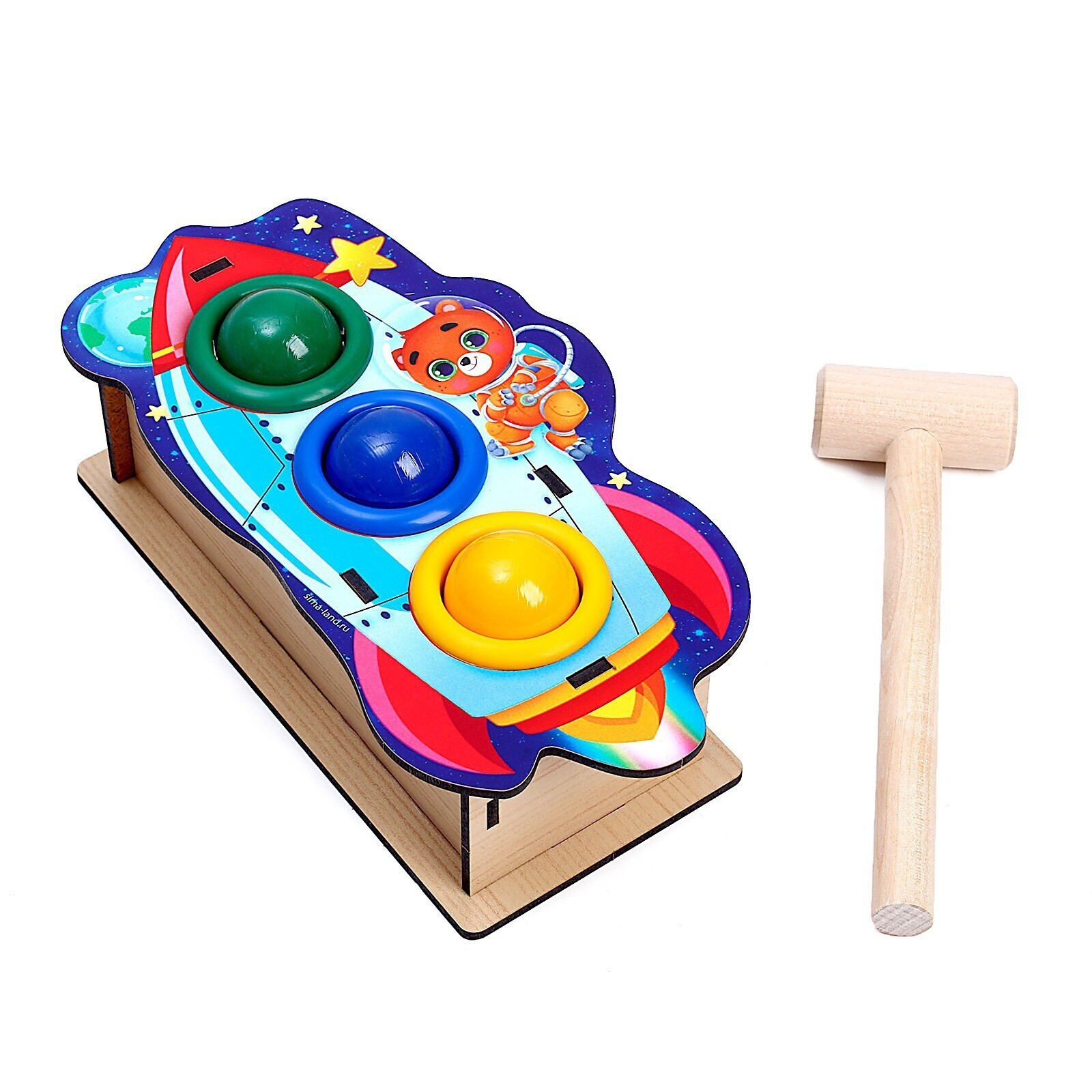 Юный испытатель берет в руки деревянный молоток, который входит в комплект, и забивает им шарик в отверстие. Когда достигнута цель, и круглый элемент попал в лунку, он выкатывается из коробочки! То же самое проделывается с остальными тремя шарами. Такое увлекательное и захватывающее занятие развивает у малышей мелкую моторику, координацию движений и целеустремленность, а также тренирует мышцы рук.