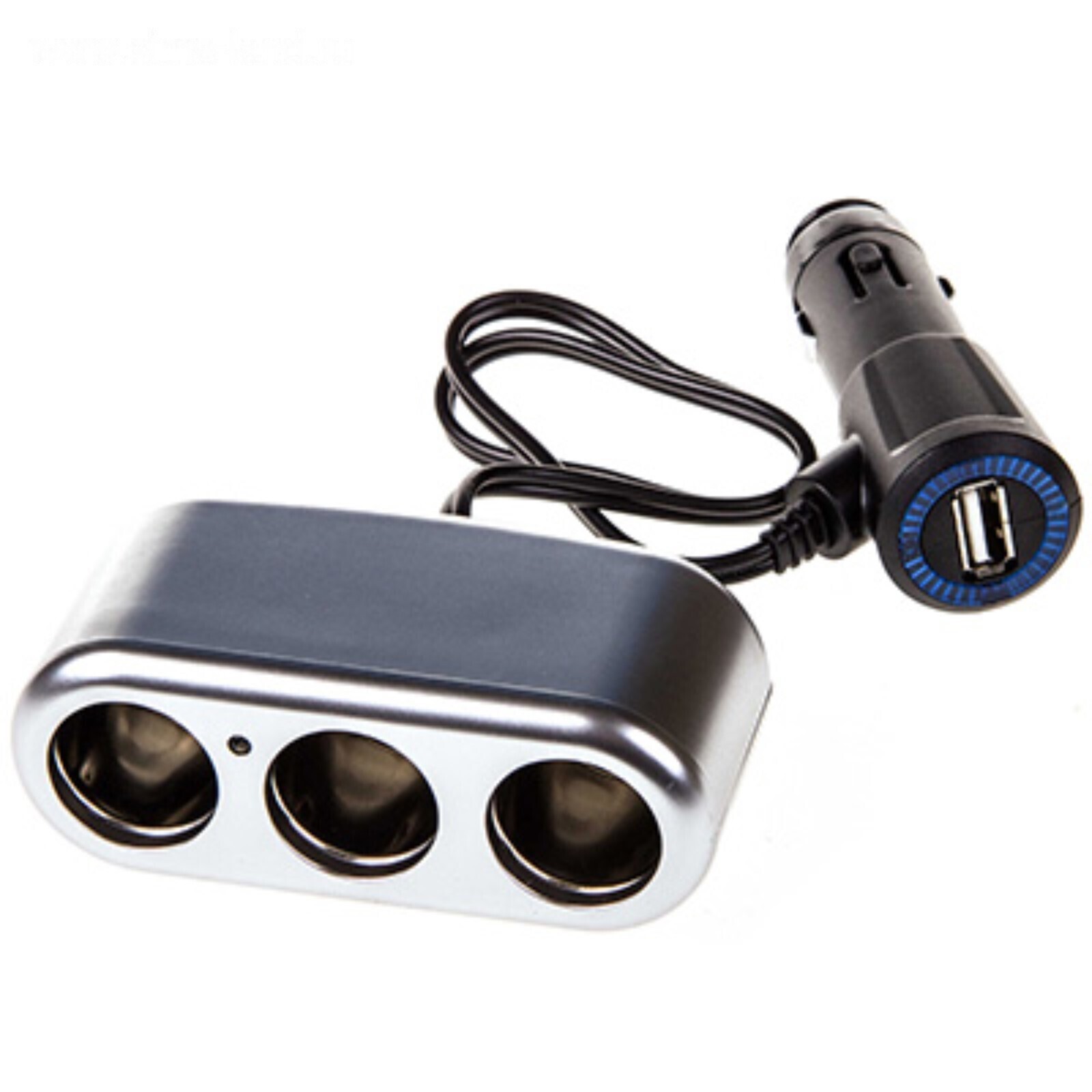 Разветвитель прикуривателя 3 гнезда + USB Skyway серебристый, предохранитель 10А, USB 1A, S02301013 SL