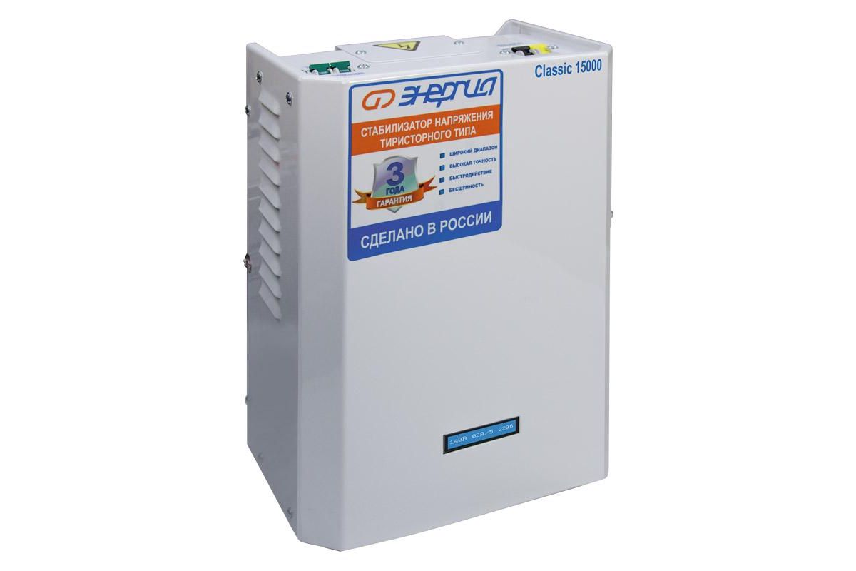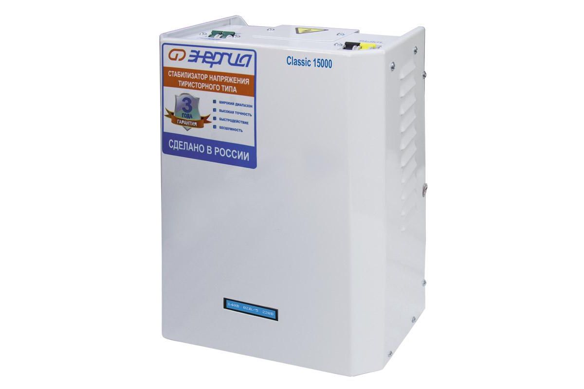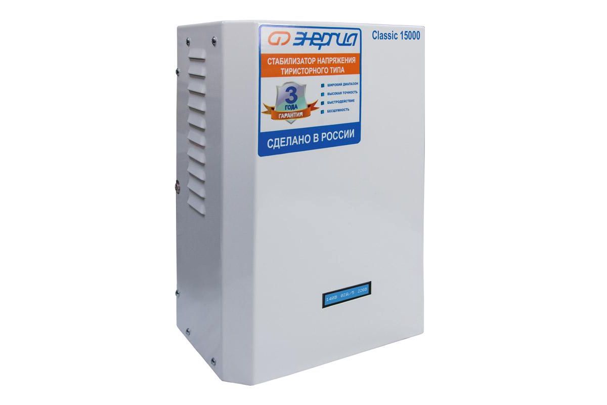 Энергия Classic 15000 - это тиристорный стабилизатор напряжения мощностью 15кВт, предназначен для защиты электротехники от скачков напряжения в однофазной сети 220В