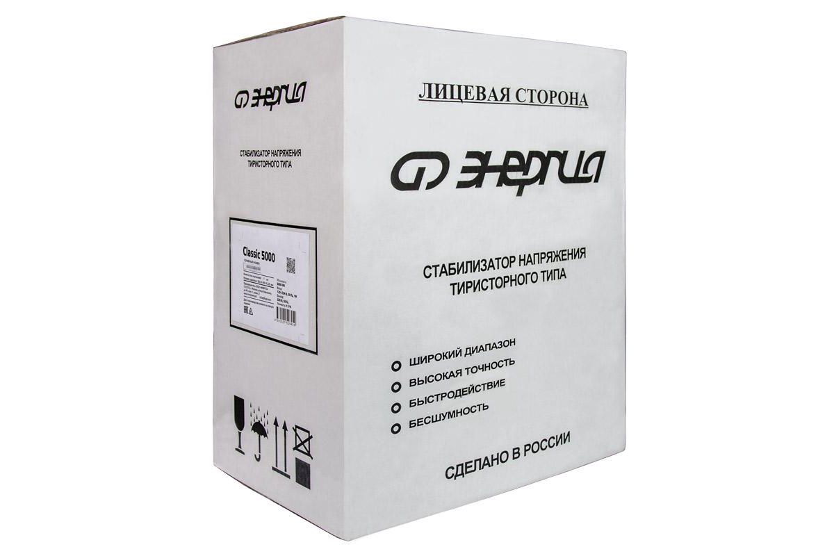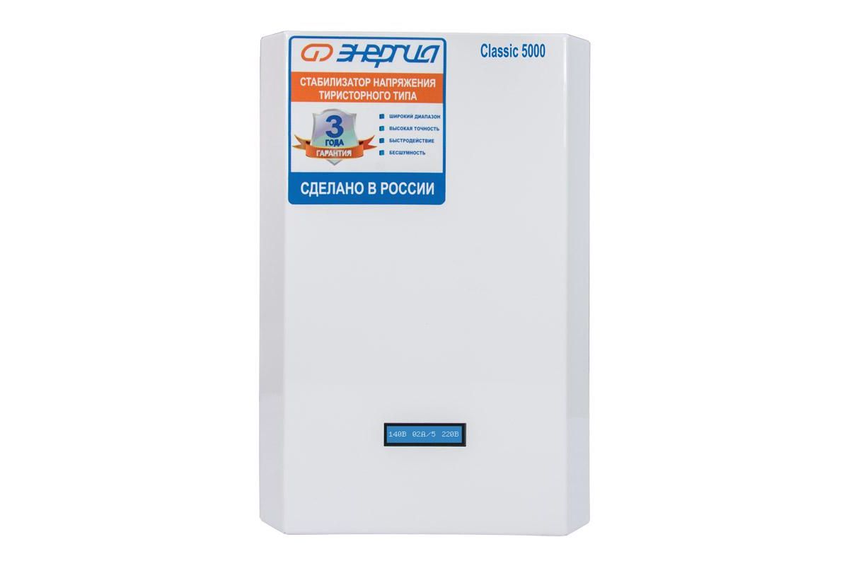 Энергия Classic 5000 - это тиристорный стабилизатор напряжения мощностью 5кВт, предназначен для защиты электротехники от скачков напряжения в однофазной сети 220В