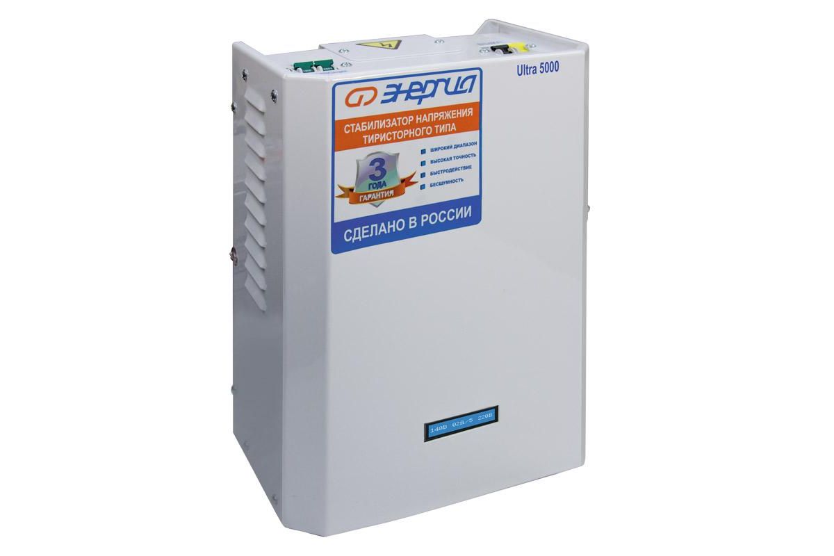 Энергия Ultra 5000 - это тиристорный стабилизатор напряжения мощностью 5кВт. Предназначен для защиты электротехники от скачков напряжения в однофазной сети 220В