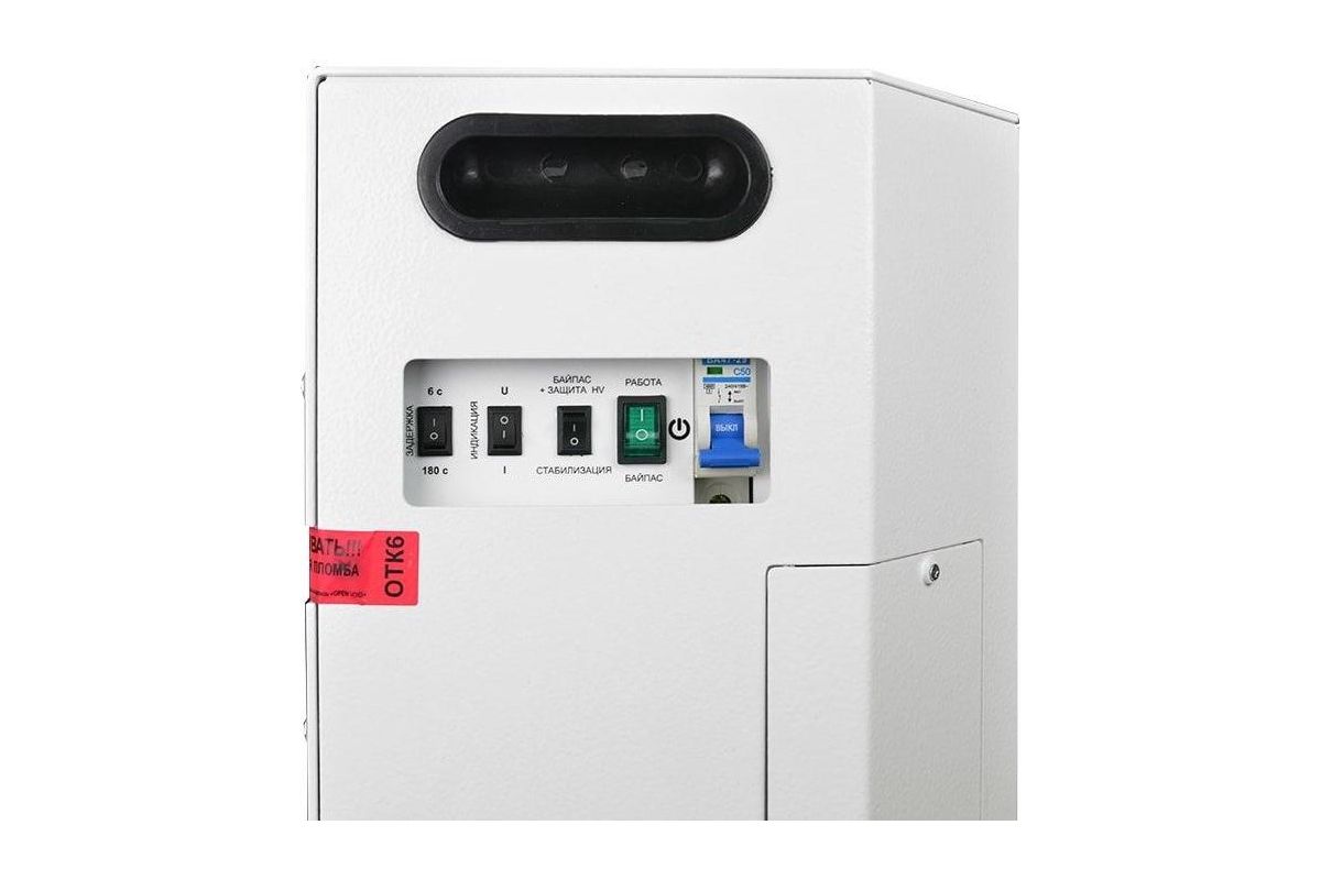 Стабилизатор оснащен функцией непрерывного самоконтроля, все параметры работы записываться в память прибора, для упрощения сервисного обслуживания и быстрого доступа к информации об истории его эксплуатации. В приборе установлен тороидальный трансформатор, для сведения к минимуму тока холостого хода, повышая КПД.