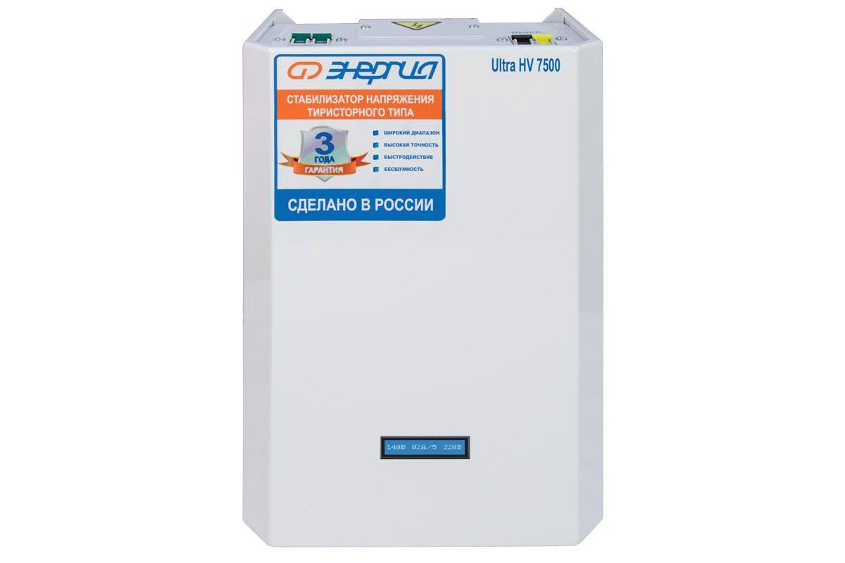 Энергия Ultra HV 7500 - это тиристорный стабилизатор напряжения мощностью 7,5 кВт. Предназначен для защиты электротехники от скачков напряжения в однофазной сети 220В