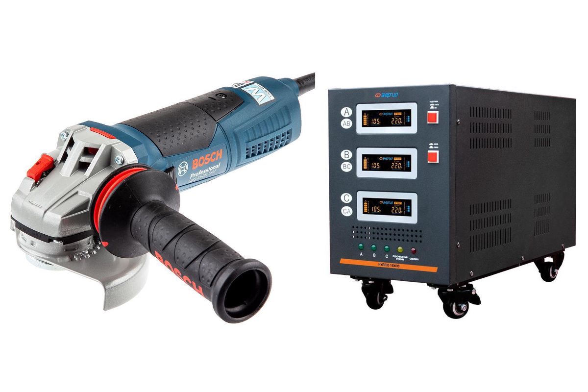 Набор: Стабилизатор ЭНЕРГИЯ Hybrid 15000/3 II поколение+УШМ (болгарка) BOSCH GWS 19-125 CIST (0.601.