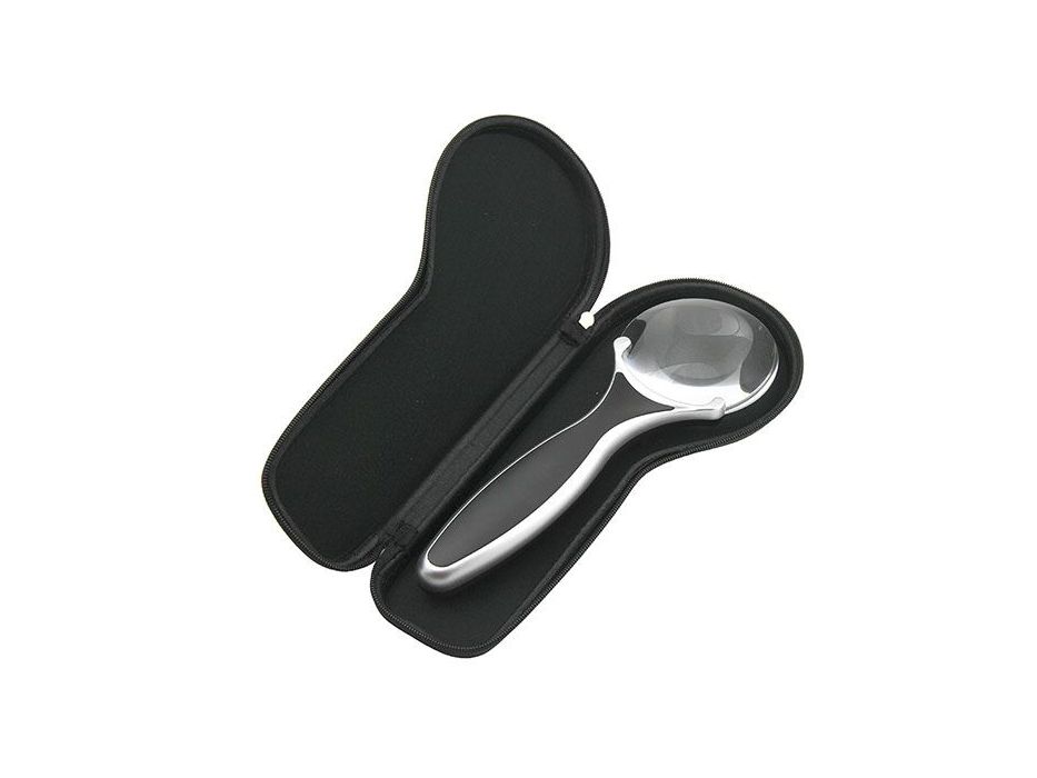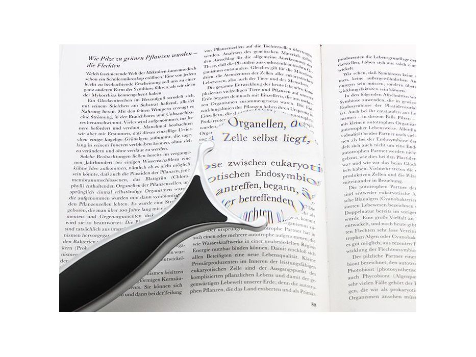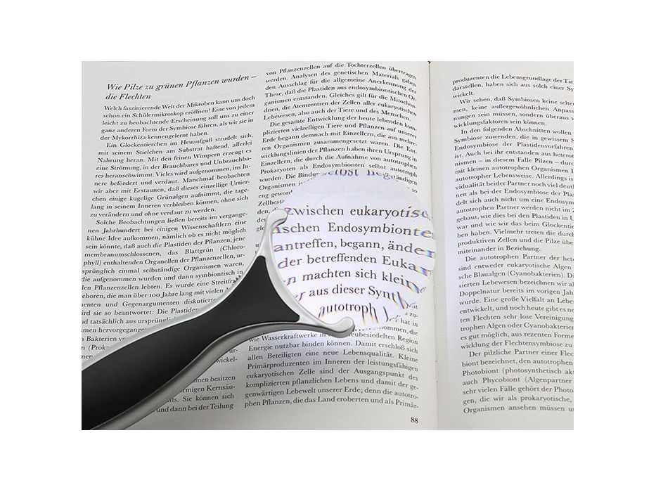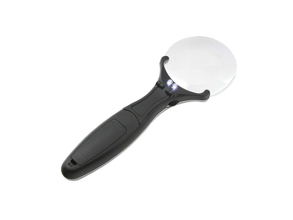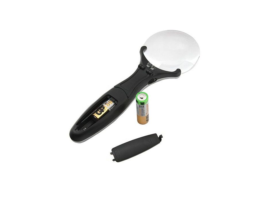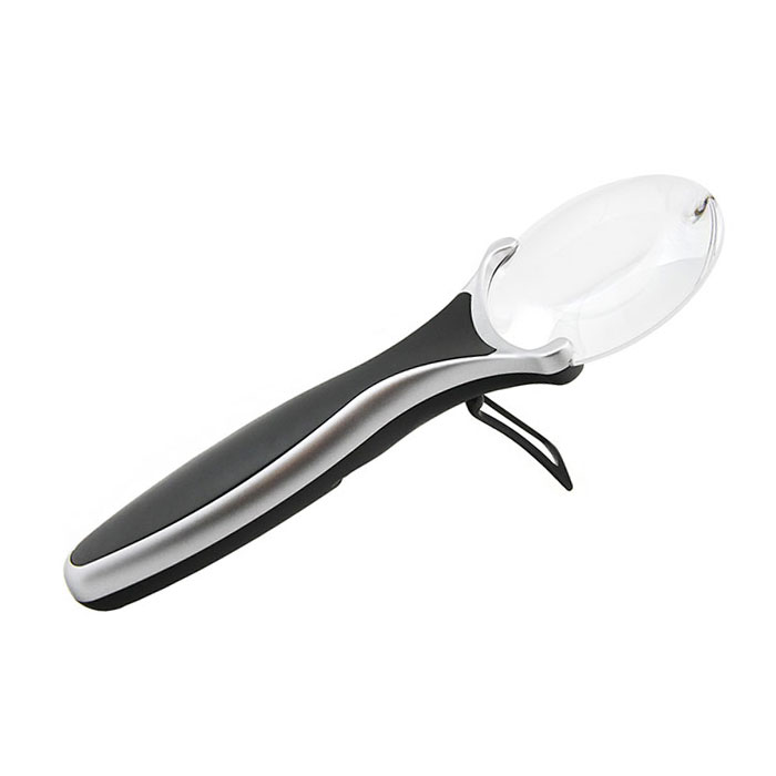 Конструкция лупы содержит выкидную подпорку для установки на плоскую поверхность. Подсветка — два светодиода.