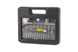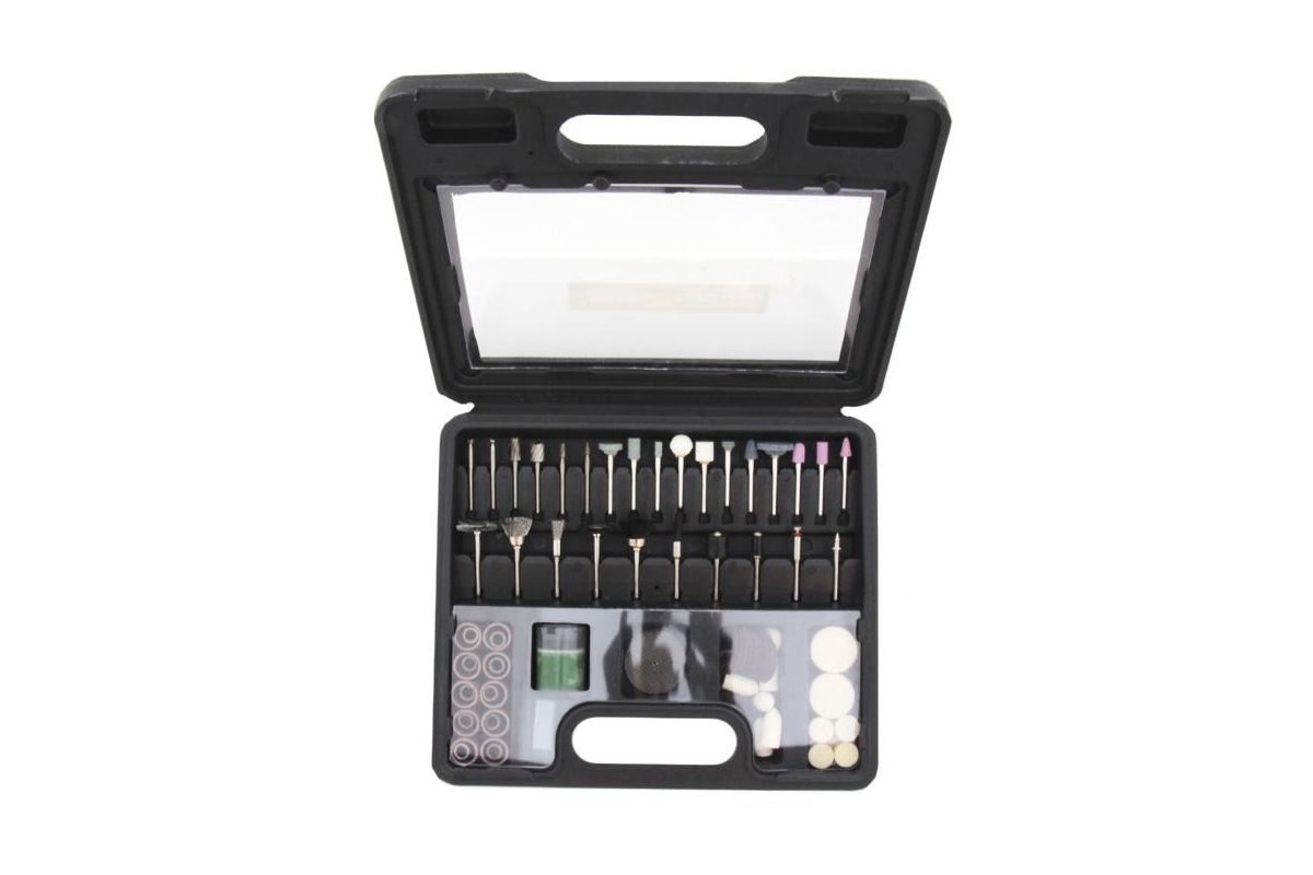 Вал с винтом (для использования отрезных дисков) -1 шт. Вал с резьбой (для использования полировальных насадок) - 1 шт. Вал с барабаном 6,3 мм - 1 шт. Вал с барабаном 13 мм - 1 шт. Шлифовальная лента 6,3 мм - 10 шт. Шлифовальная лента 13 мм - 10 шт. Канифольный отрезной диск - 10 шт. Отрезной диск абразивный - 26 шт. Паста ГОИ - 1 шт. Правочный камень - 1 шт. Войлочная полировальная насадка «цилиндр» - 5 шт. Войлочный полировальный круг 13 мм - 5 шт. Войлочный полировальный круг 24 мм - 5 шт. Шлифовальная насадка - 11 шт. Щетка металлическая - 3 шт. Щетка жесткая - 3 шт. Фреза металлическая - 6 шт.
