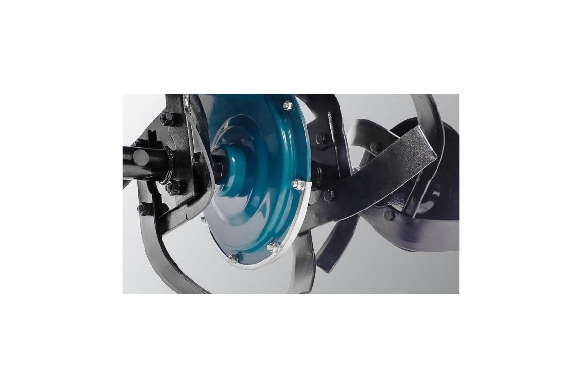Щиток на корпусе повышает безопасность при работах с культиватором. Предотвращает вылет земли на лицо или одежду.