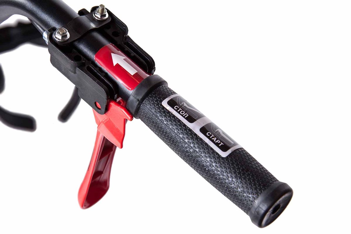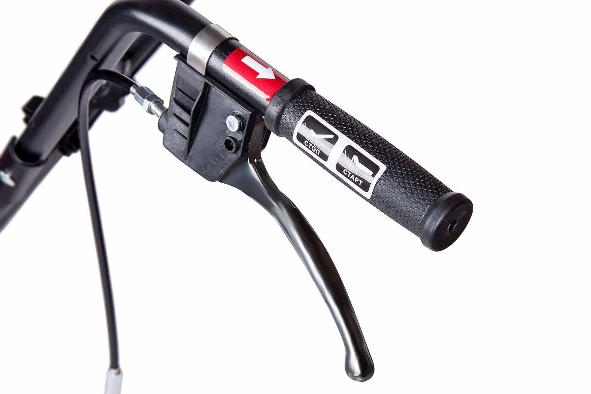 Удобные прорезиненные рукоятки легко регулируются, что обеспечивает контроль скоростного режима и простое управление устройством. Запуск осуществляется ручным стартером.