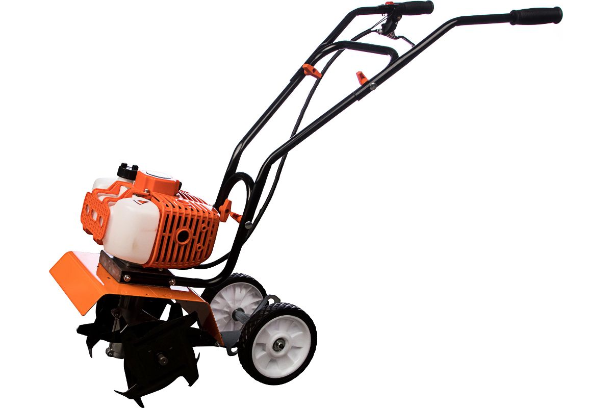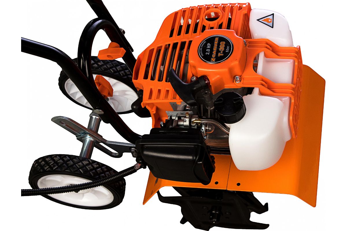 CARVER T-300 – двухтактный мотокультиватор для обработки почвы под кустами, около деревьев, между грядками и в других труднодоступных местах. Мощность — 3 л.с. Для удобства работы имеются регулируемые прорезиненные рукояти с элементами управления. Благодаря наличию транспортировочных колес, перемещение агрегата становится легче.