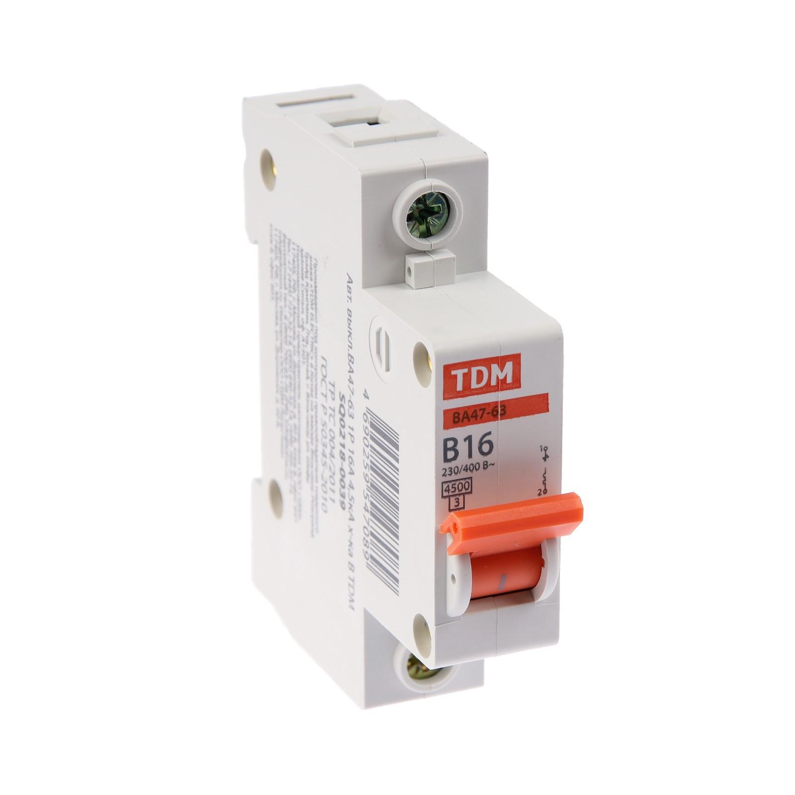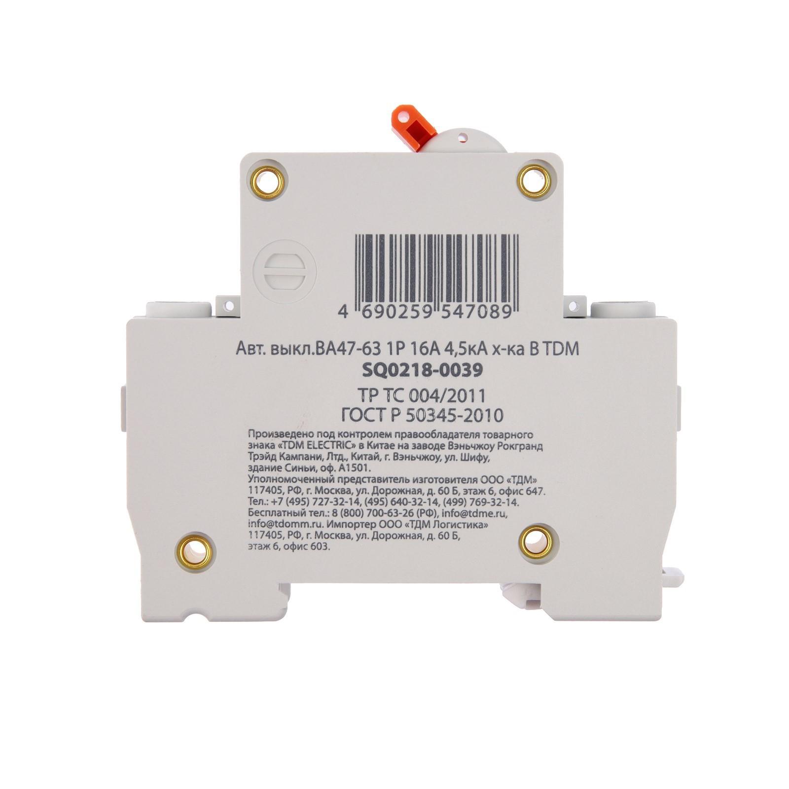 Выключатель автоматический TDM ВА47-63, 1п, 16 А, 4.5 кА, В, SQ0218-0039
