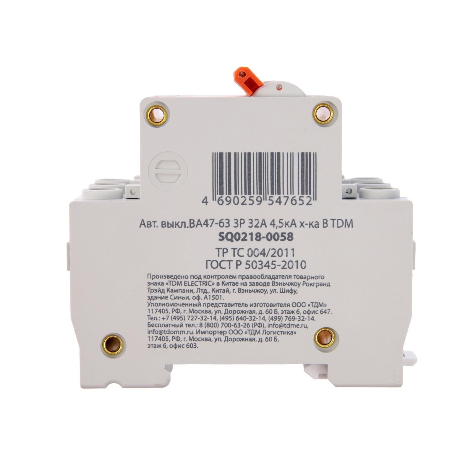 Выключатель автоматический TDM ВА47-63, 3п, 32 А, 4.5 кА, В, SQ0218-0058