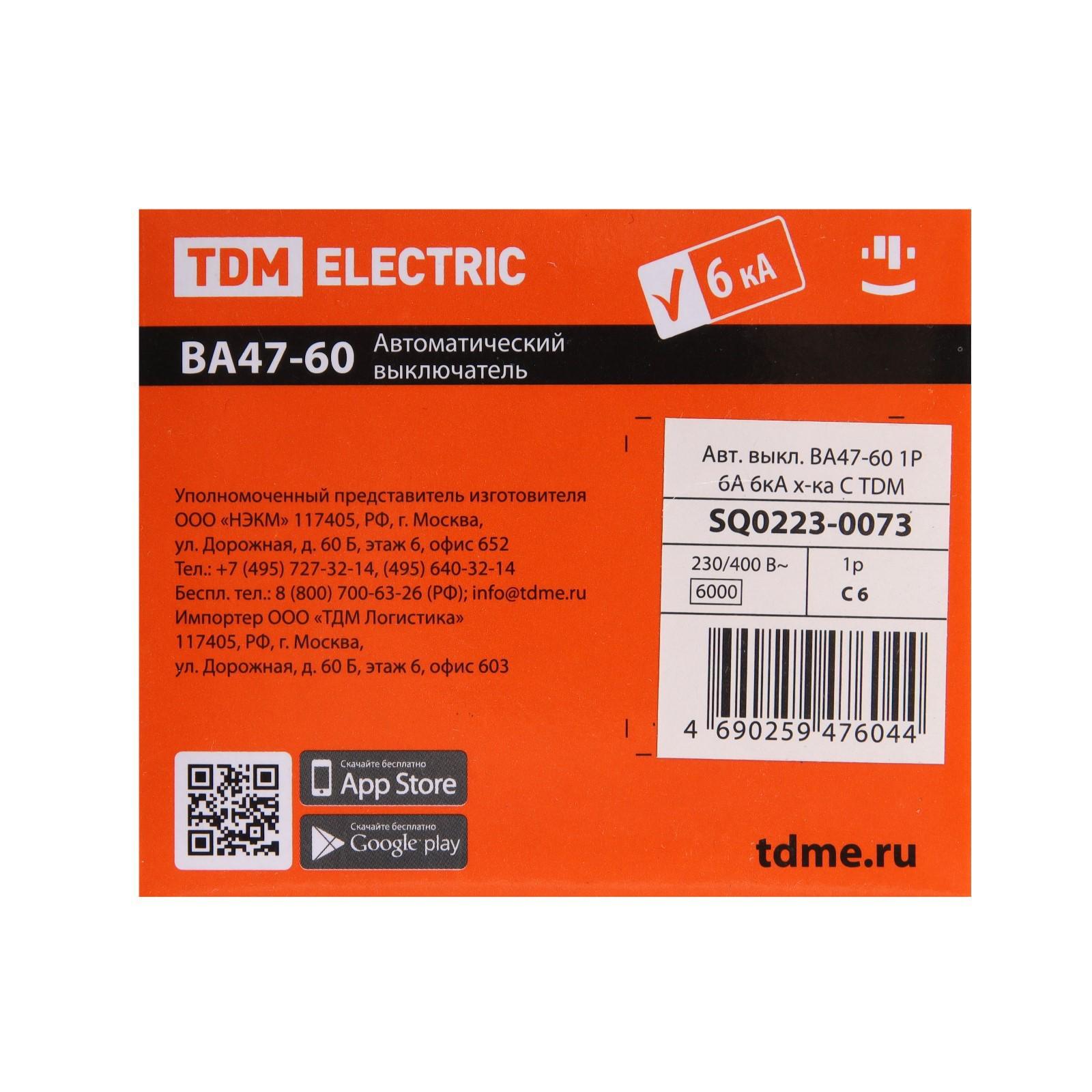 Выключатель автоматический TDM ВА47-60, 1п, 6 А, 6 кА, С, SQ0223-0073