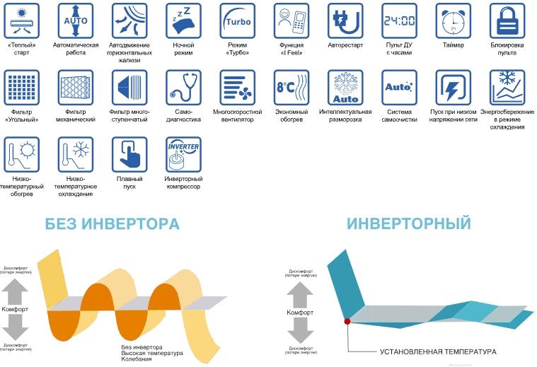 - Режим работы охлаждение, обогрев, вентиляция, осушение, автоматический, сон (тишина), турбо-режим