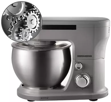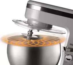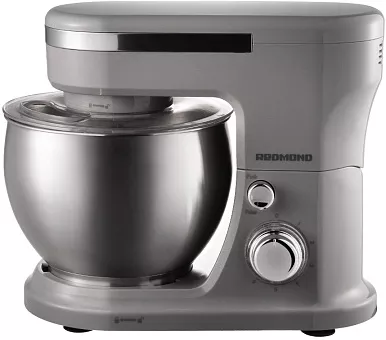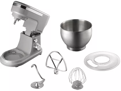 Стационарный миксер, мощность 1100 Вт, количество скоростей 6, режим смешивания импульсный, объём чаши 5 л, материал чаши нерж. сталь, насадки: венчики для взбивания, для теста.