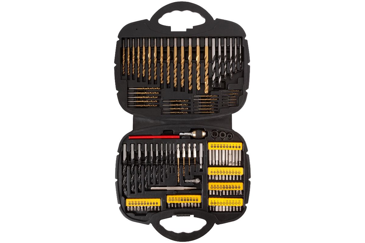 Набор: 35 HSS свёрл с титановым покрытием; 4 титановых HSS сверла с шестигранным хвостовиком; 50 хром-ванадиевых бит длиной 25 мм; 10 хром-ванадиевых бит длиной 50 мм; зенкер; пробойник; быстрозажимной фиксатор; карандаш для дерева; 3 ограничителя глубины отверстия для свёрл; адаптер для бит; 6 свёрл по бетону; 10 свёрл по дереву. Упаковка: пластиковый чемодан.