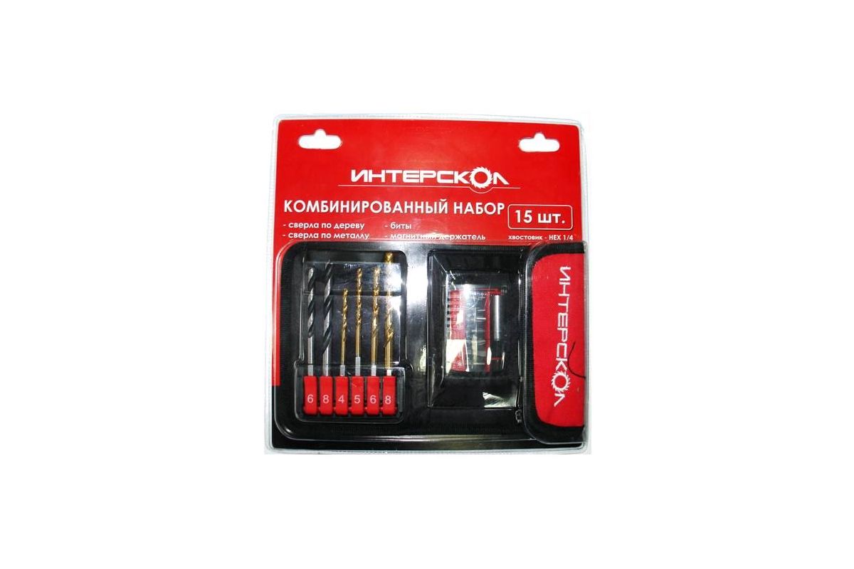 Набор бит и сверл ИНТЕРСКОЛ 2039900700000 15пр., сверла по дереву, сверла по металлу, биты Расходные материалы и оснастка