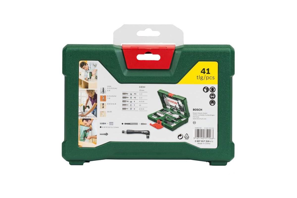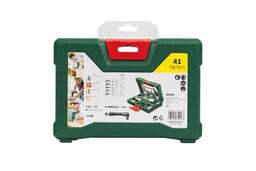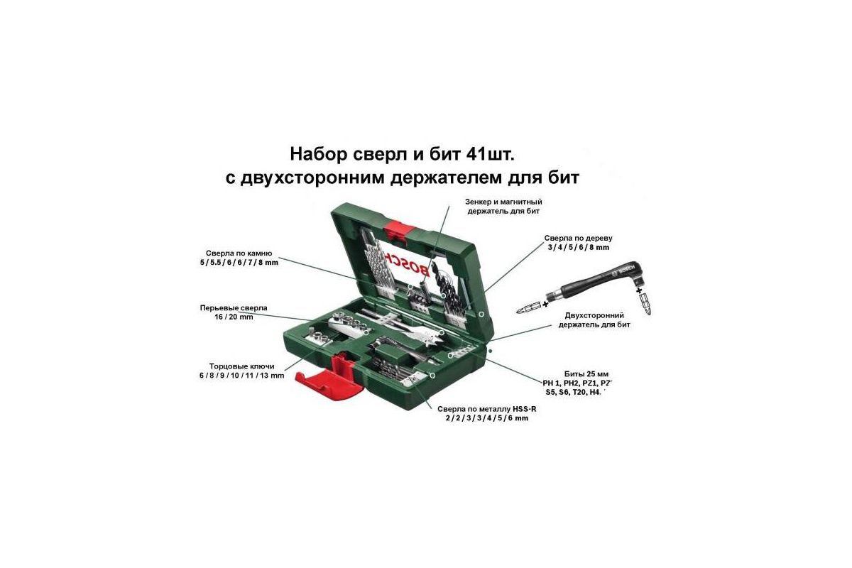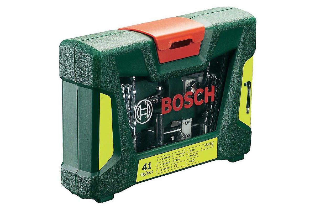 BOSCH V-Line-41 – набор оснастки для бытового ремонта. Состоит из свёрл, бит, торцевых головок, зенкера и двухсторонней отвёрточной рукоятки. Всего – 41 предмет. Пригодится дома или на даче. Поставляется в прочном пластиковом кейсе.