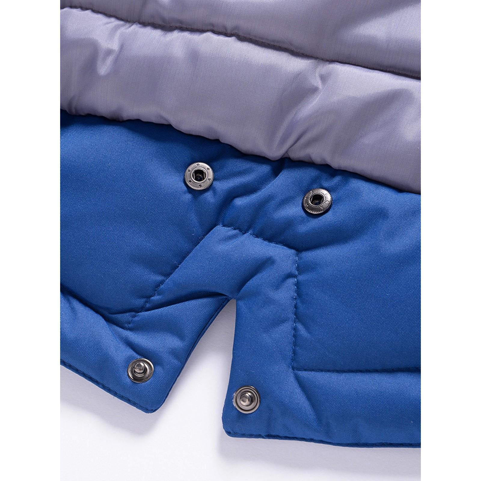 Съёмный капюшон на кнопках с боковыми резинками и манжеты рукавов на резинке.