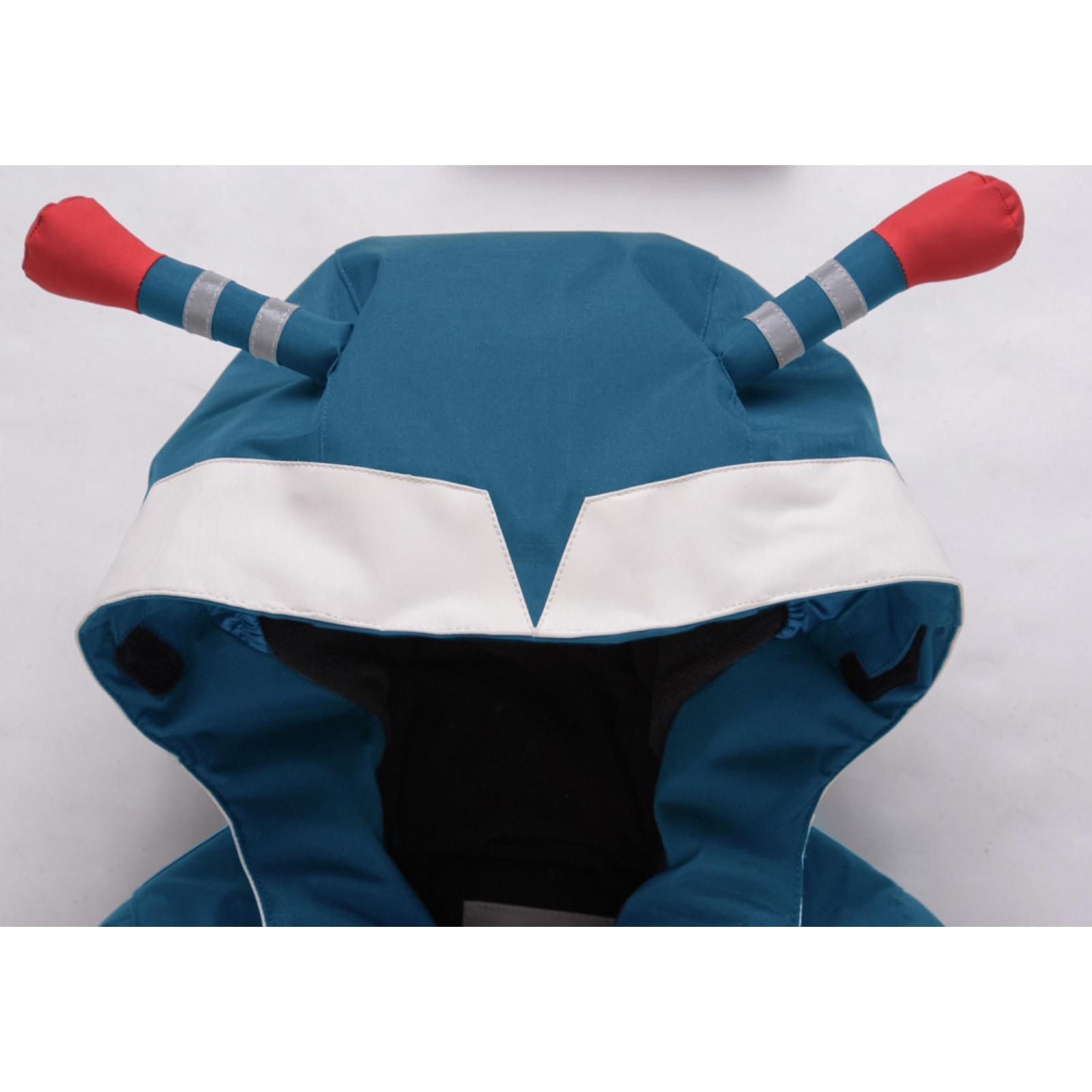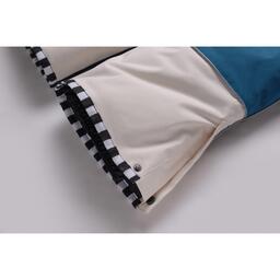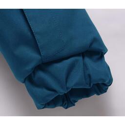 Съёмный капюшон на кнопках с боковыми резинками и манжеты рукавов на резинке.